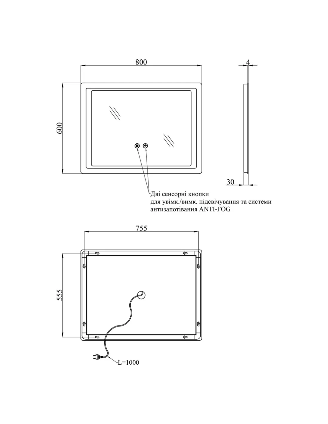 - LED-підсвічування по периметру зеркала, вбудоване;