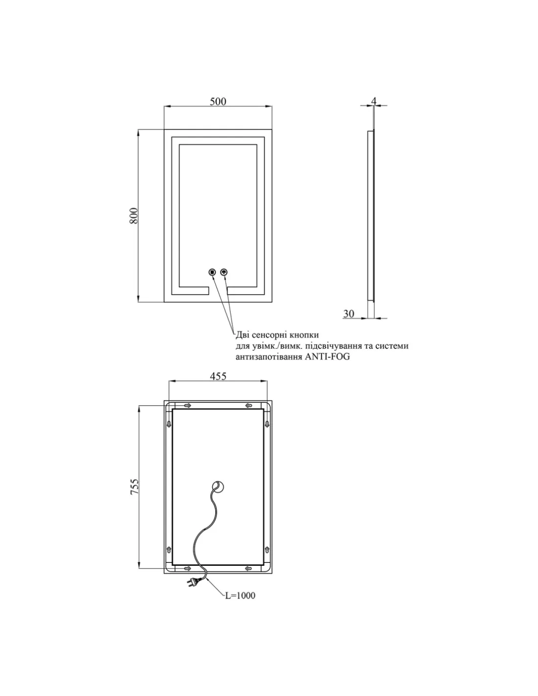 - Висота зеркала: 500 мм;