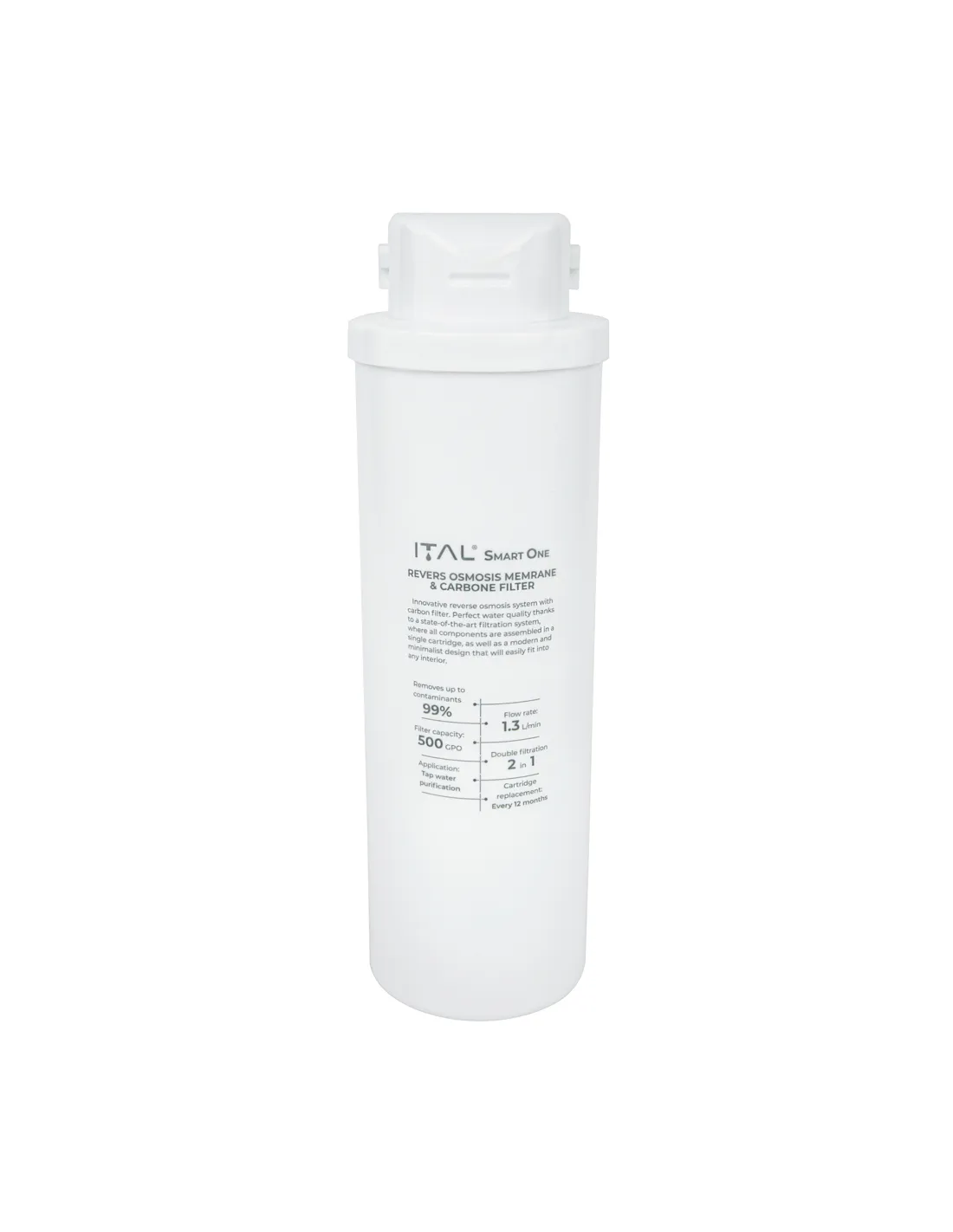 Постфільтр-мембрана ITAL Smart One IWC500SMO виконаний із безпечних матеріалів та елементів для здоров`я споживачів при контакті з питною водою. Призначений для очищення холодної води. Не слід використовувати змінний картридж довше (або для очищення більшого об`єму води), ніж рекомендовано виробником (картриджі необхідно міняти не рідше ніж 1 раз на півроку). При першому увімкненні фільтра для питної води з новим картриджем перші 10 літрів очищеної води необхідно злити в каналізацію.