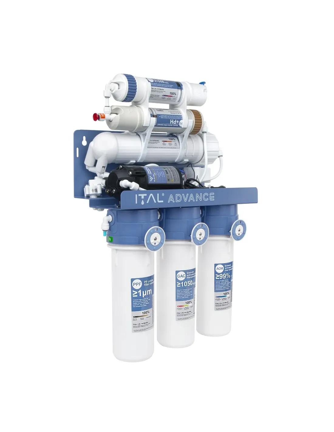 Фільтр зворотного осмосу ITAL Advance комплектується помпою (насосом), який призначений для забезпечення потрібного тиску води під час подачі на мембрану зворотного осмосу. Таким чином гарантуючи якісну та довговічну роботу фільтра. Система постачається разом із краном для чистої води та кріпленнями для його встановлення.