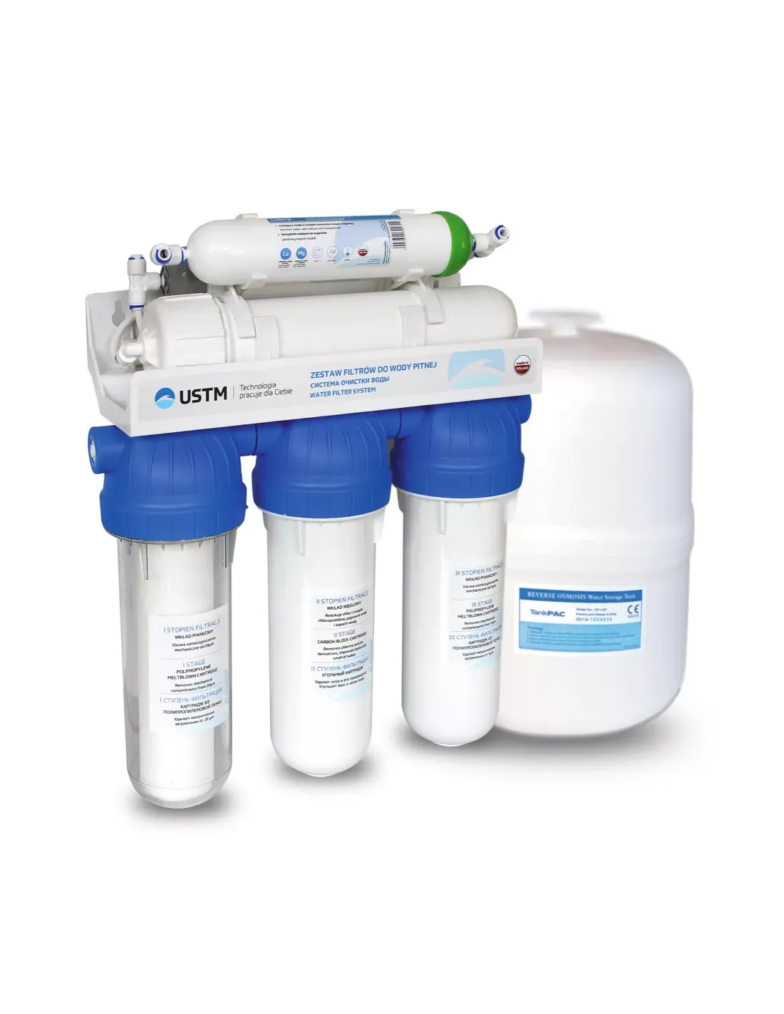 Фільтр зворотного осмосу USTM RO 6 12 EMI PM призначений для очищення води від усіх відомих та невідомих забруднювачів. Застосовується для холодної води в кафе, ресторанах, готелях та інших об`єктах, де необхідна висока продуктивність та якість очищення води. Є шестиступінчастою системою. Кріпиться на спеціальну раму, яка стійка до механічних навантажень. Комплектація: зворотньоосмотичні мембрани, корпус мембрани, корпуси для картриджів, картридж механічного очищення, вугільний гранульований картридж, вугільний пресований картридж, постфільтр, впускний соленоїдний клапан, редуктор тиску, помпа, кран для питної води, накопичувальний бак, сталева рама для колб мембрани та колб. Робоча температура: від 4 до 40 градусів за Цельсієм. Діаметр підключення: 0,25 х 0,37 дюйми. Гарантія 12 місяців. Країна-виробник - Польща.