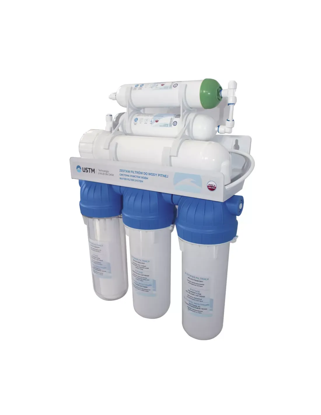 Фільтр зворотного осмосу USTM RO 6 12 EMI PM - це високопродуктивна система очищення води, яка складається із шести колб та рами, на яку вони кріпляться. Завдяки змінним картриджам система здатна очищати воду у кілька етапів. Встановлюється під стільницею, але в її поверхню виводиться зручний кран подачі очищеної води. Підходить у тих випадках, коли немає можливості поставити накопичувальний бак.