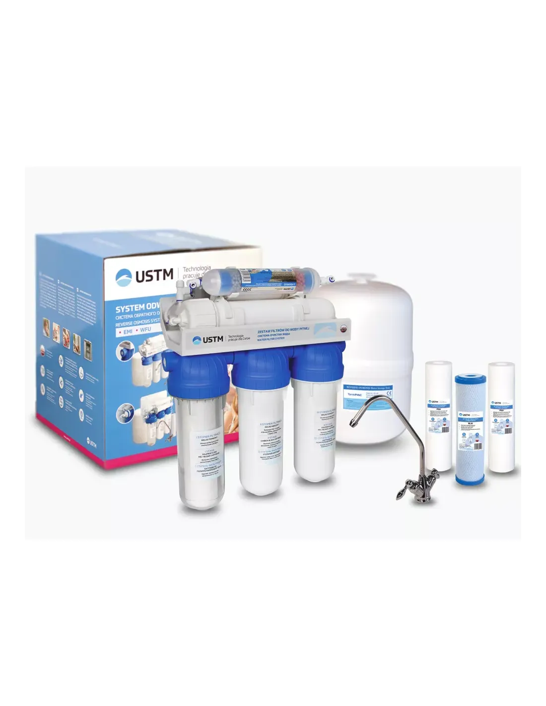 Фільтр зворотного осмосу USTM RO 6 12 EMI PM має 6 щаблі фільтрації: 1 ступінь - попропіленовий картридж, який видаляє відкладення, такі як: пісок, мул, іржа, завислих речовин до 5 мкм. 2 ступінь - видаляє хлор та різні органічні сполуки. 3 ступінь – картридж, який видаляє хлор, пестициди, органічні речовини, знижує концентрацію важких металів. 4 ступінь – високопродуктивна зворотноосмотична мембрана, що очищає воду до 99,9 %. Через мембрану проходить лише молекула води. Решта домішок зливається в дренаж. 5 ступінь - мінералізатор, 6 ступінь - постфільтр, який виконує доочищення води, а також покращує смак та запах води.