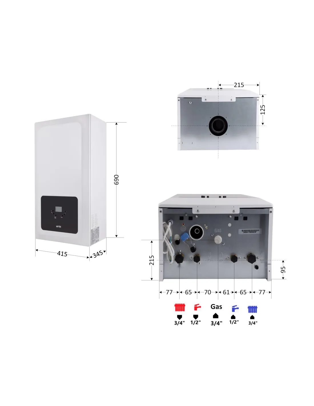 Газовий котел Airfel Optimum Premix призначений для гарячого водопостачання та опалення житлових будинків та квартир без облаштування системи для димоходу. Тип казана – газовий, конденсаційний. Встановлюється на стіну. Площа опалення до 300 кв. Потужність – 30 кВт. ККД – 109%. Об`єм розширювального бака – 10 л. Розміри – 413х346х694 мм. Вага 36,5 кг. Гарантія 3 роки. Країна виробник – Туреччина.