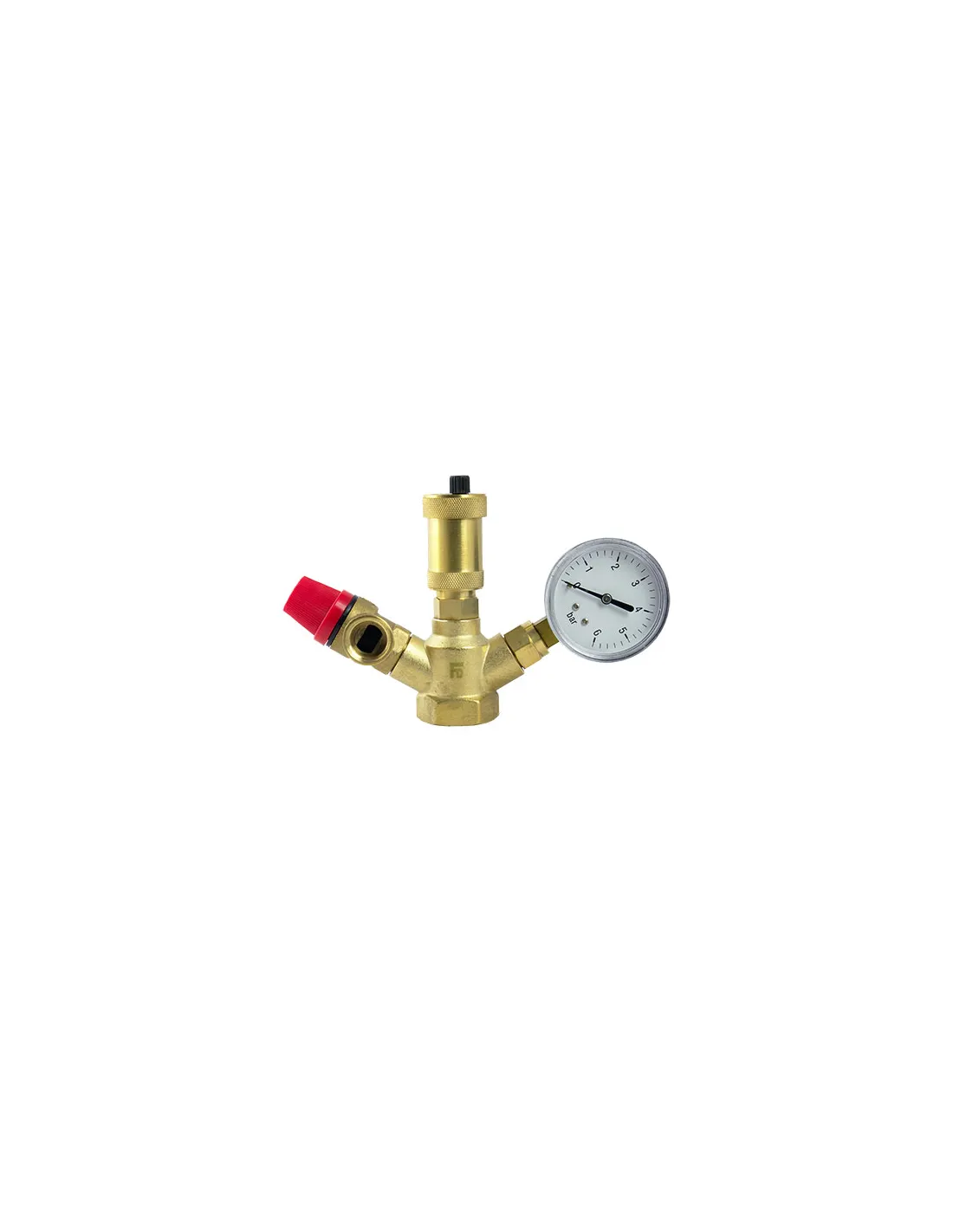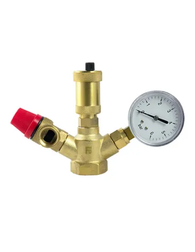 Група безпеки котла Fado призначена для захисту опалювальних систем від надлишкового тиску та запобігання пошкодженню обладнання. Тиск спрацьовування – 3 бар. Діаметр підключення – 1 дюйм. Комплектація: автоматичний відвідник повітря, запобіжний клапан, манометр. Максимальна робоча температура на вході в колектор – 120 градусів за Цельсієм. Номінальний тиск не вищий за 10 бар. Матеріал виробу – латунь. Різьблення - внутрішнє. Гарантія 12 місяців. Країна виробник – Італія.