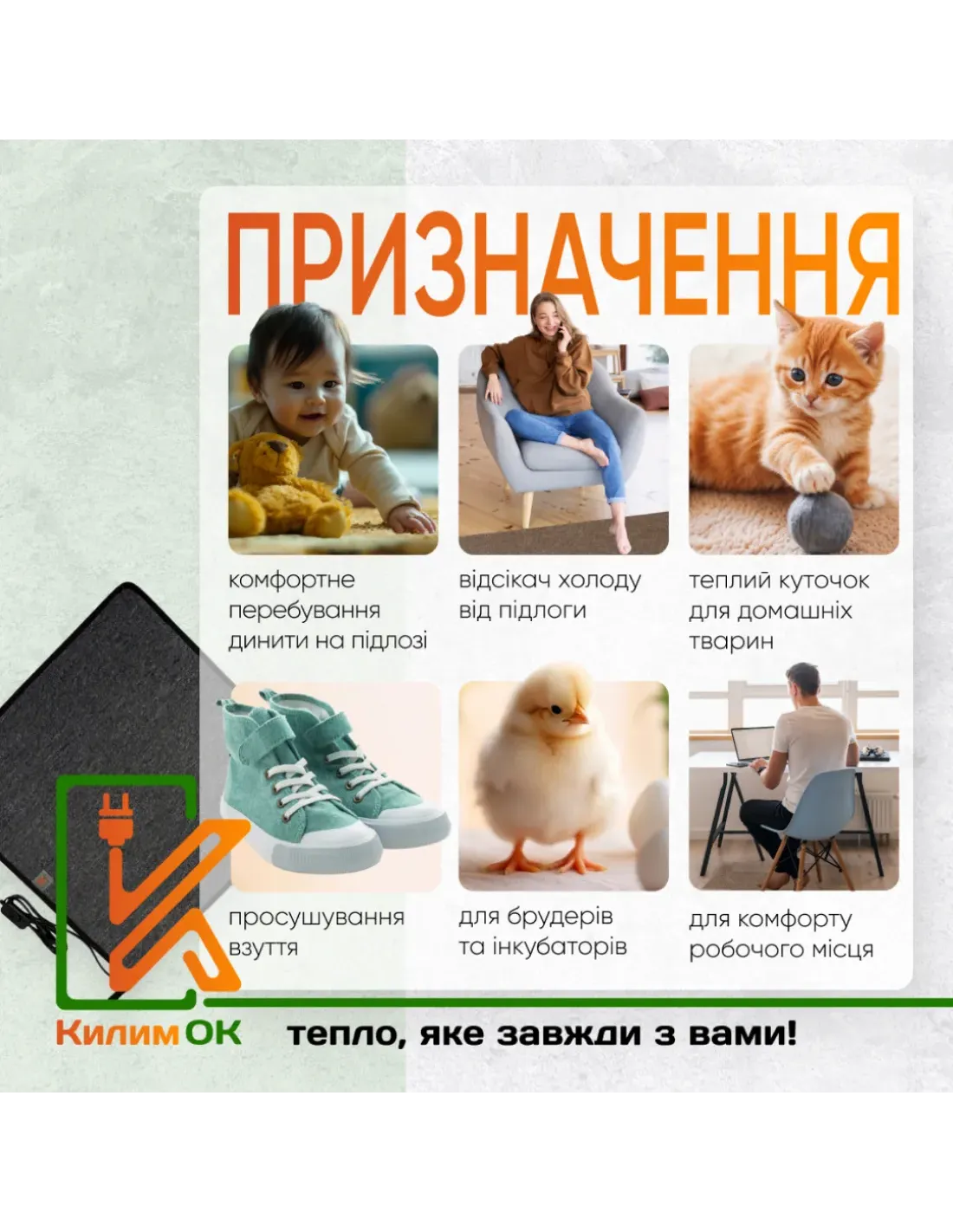 Електричний килимок з підігрівом KulumOk K100-50-GY 50 х 100 см сірий може використовуватися не тільки для зігрівання ніг, забезпечуючи їм комфортні умови для перебування на підлозі, але й часто застосовується в якості сушіння взуття, що розташовується на вході в будинок для улюбленого місця. інкубаторів.