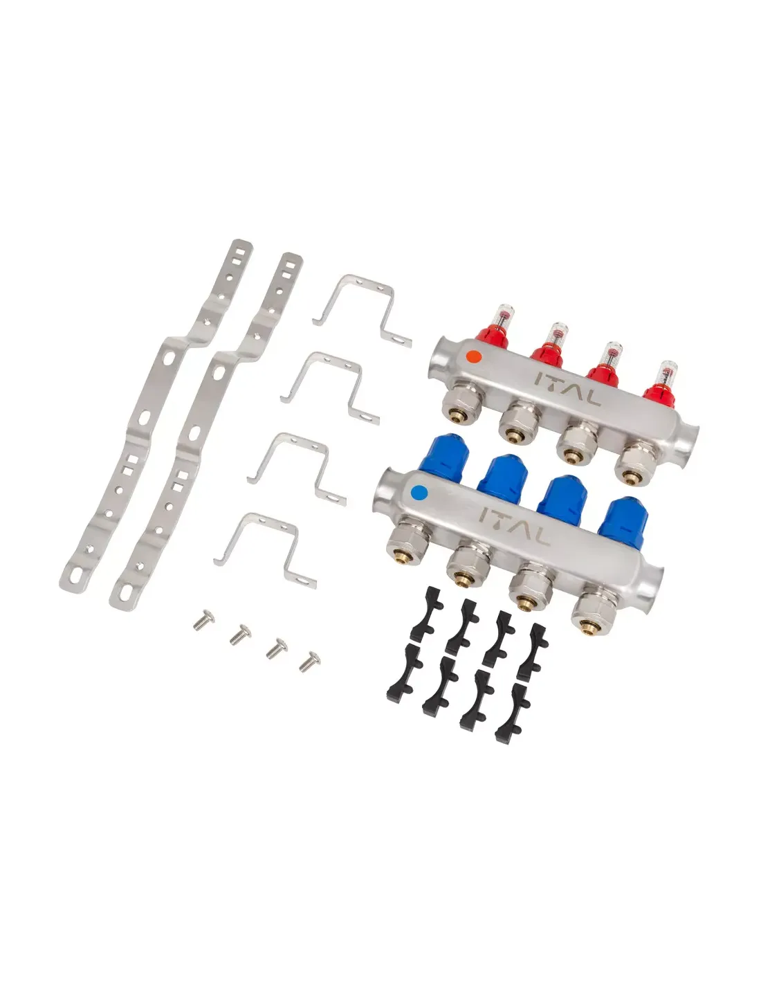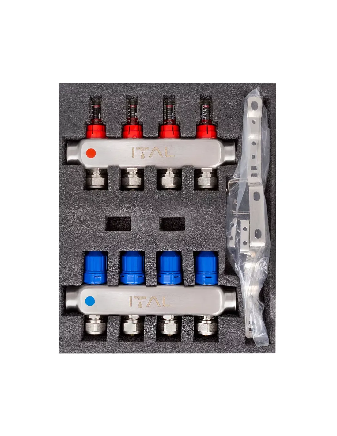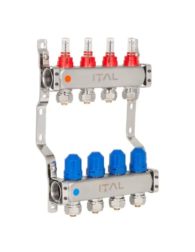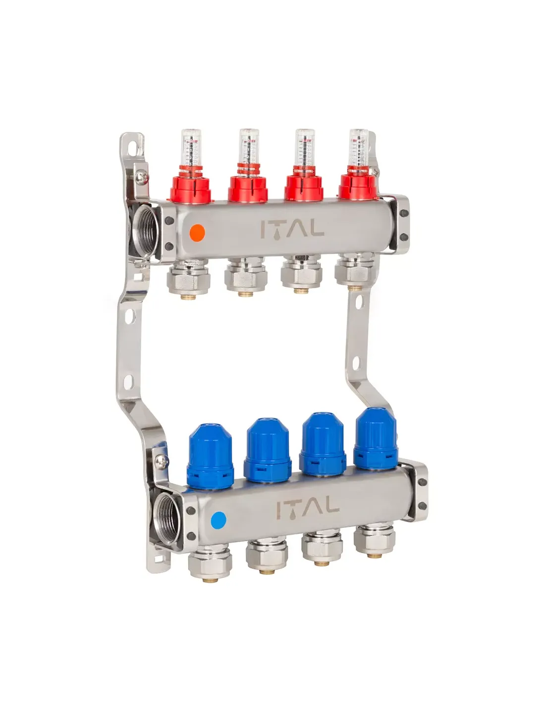 Колектор латунний з витратомірами ITAL HC1-04 з витратомірами призначений для розподілу теплової енергії в системі водяної теплої підлоги. Ця установка застосовується у системах опалення, підключених до високотемпературного котла. Колекторна група дозволяє розподіляти теплоносій за високої температури у вторинному контурі із заданою температурою. Теплоносій надходить з первинного контуру, де температура вища, щоб забезпечити правильну роботу системи теплої підлоги.