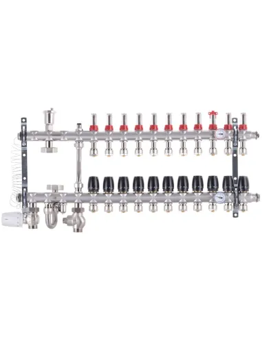 Коллектор із вбудованим змішувальним вузлом та євроконусами Koer KR.S1012-11 SUS304 призначений для розподілу теплової енергії в системі водяна тепла підлога. Ця установка застосовується у системах опалення, підключених до високотемпературного котла. Колекторна група дозволяє розподіляти теплоносій за високої температури у вторинному контурі із заданою температурою. Теплоносій надходить з первинного контуру, де температура вища, щоб забезпечити правильну роботу системи теплої підлоги.
