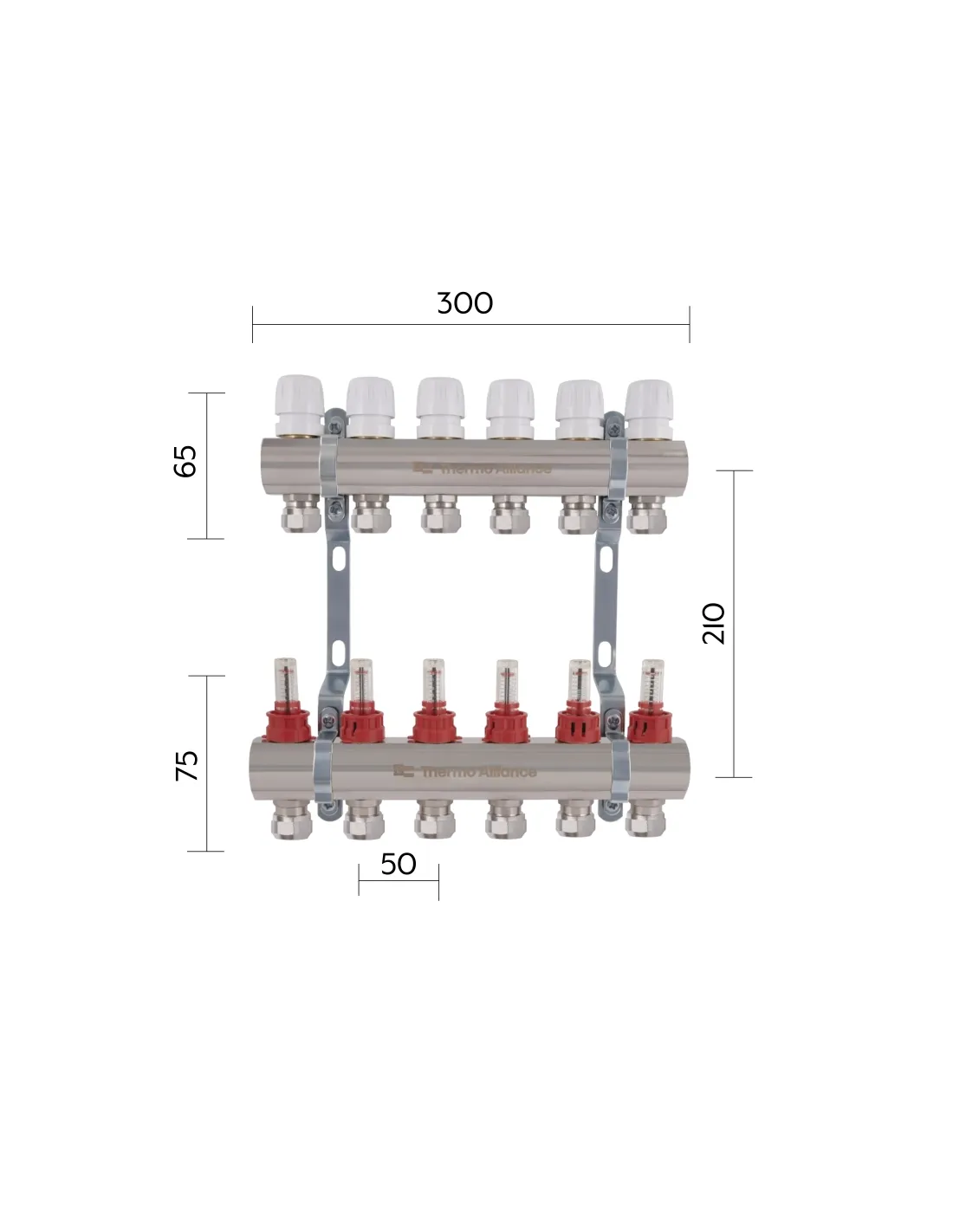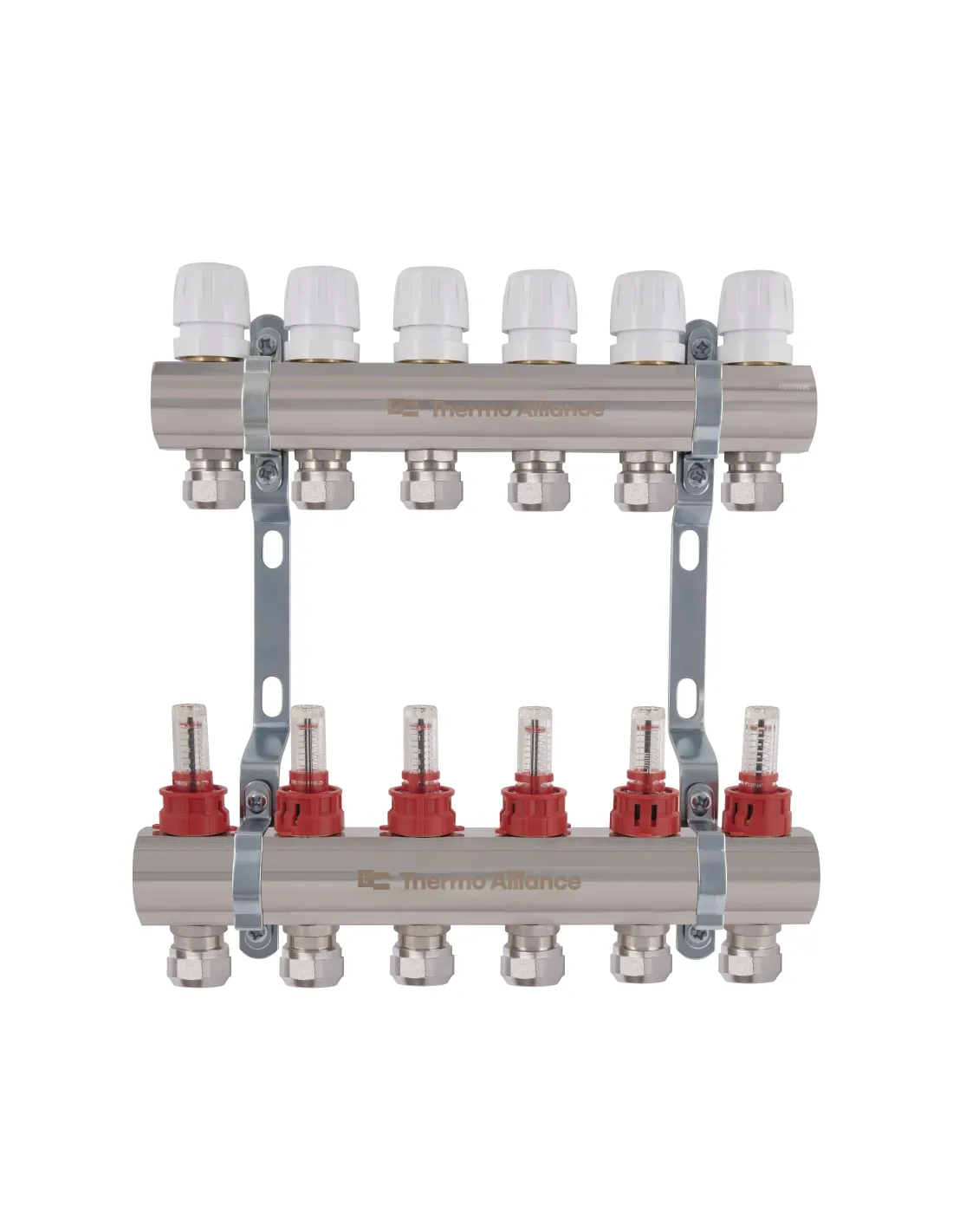 Колектор латунний Thermo Alliance Standart TAS235W6E з витратомірами та євроконусами призначений для розподілу теплової енергії в системі водяної теплої підлоги. Ця установка застосовується у системах опалення, підключених до високотемпературного котла. Колекторна група дозволяє розподіляти теплоносій за високої температури у вторинному контурі із заданою температурою. Теплоносій надходить з первинного контуру, де температура вища, щоб забезпечити правильну роботу системи теплої підлоги.