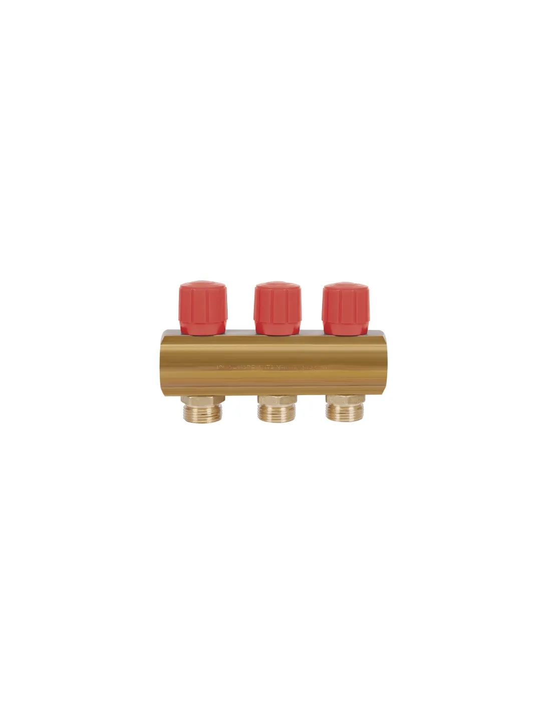 Коллектор розподільний Icma № 1105 Red, 3 виходи, 1 дюйм застосовується у системах ГХВС. Установка гребінки дозволяє забезпечити рівномірний розподіл гарячої/холодної води за точками розбору. Розподільний колектор оснащений регулювальними кранами з ручками червоного кольору, встановленими безпосередньо на корпусі та розрахованими тільки на ручне регулювання.