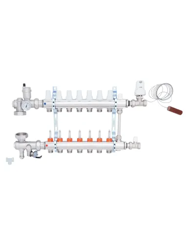Коллекторні групи у зборі виробництва ICMA Арт. A2K013 призначені для розподілу теплоносія в системі опалення теплої підлоги, і допомагають покращити керування опаленням в окремих контурах системи "теплої підлоги". низькотемпературної системи опалення підлоги. Колекторна група має сім контурів.