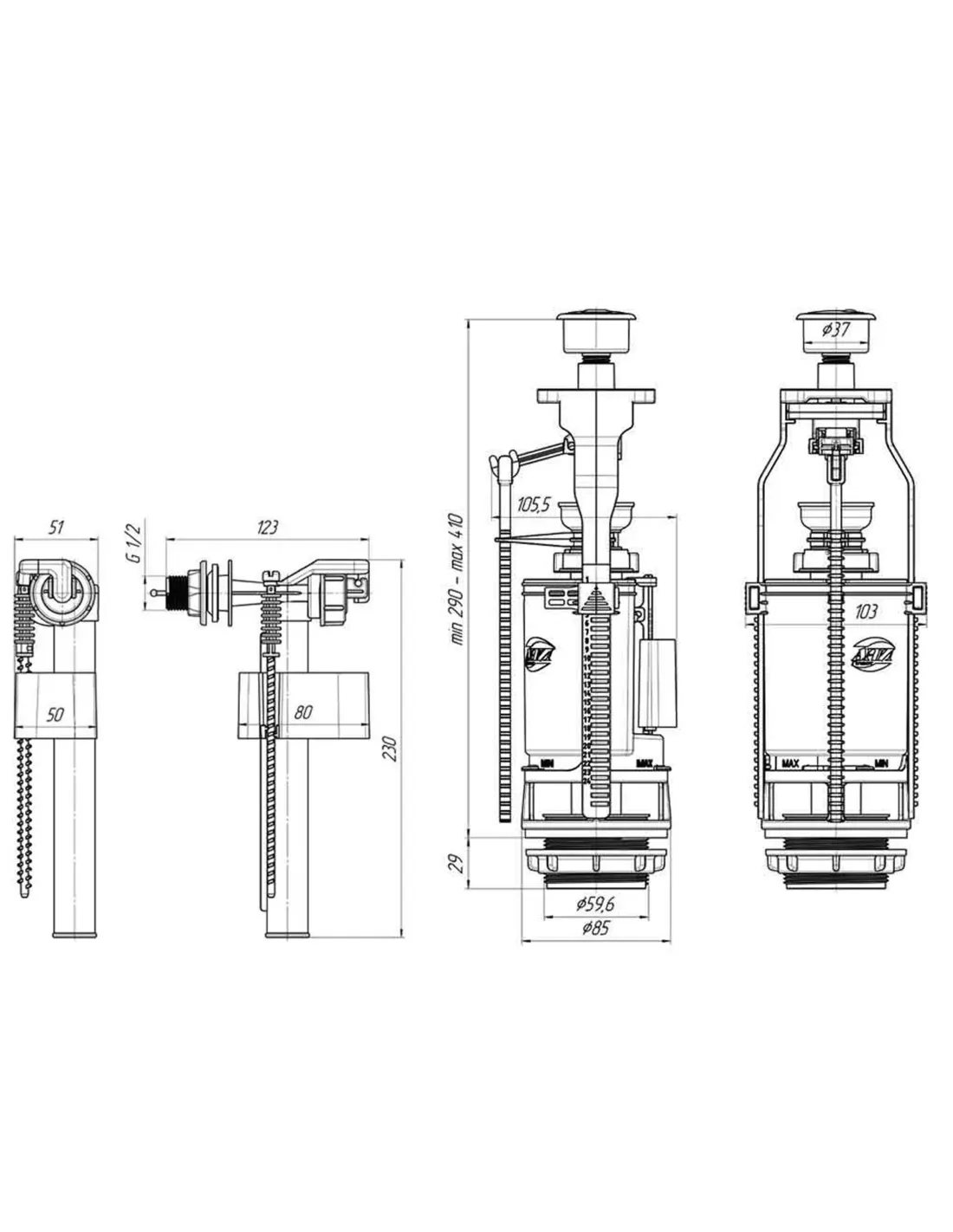 Комплект арматури для зливного бачка Optimum OPTI 1110 2 режими, бічний підвід 1/2 дюйма - повний набір механізмів для відновлення роботи унітазу. Система двох кнопок дозволяє суттєво економити воду, вибираючи повний або малий злив.