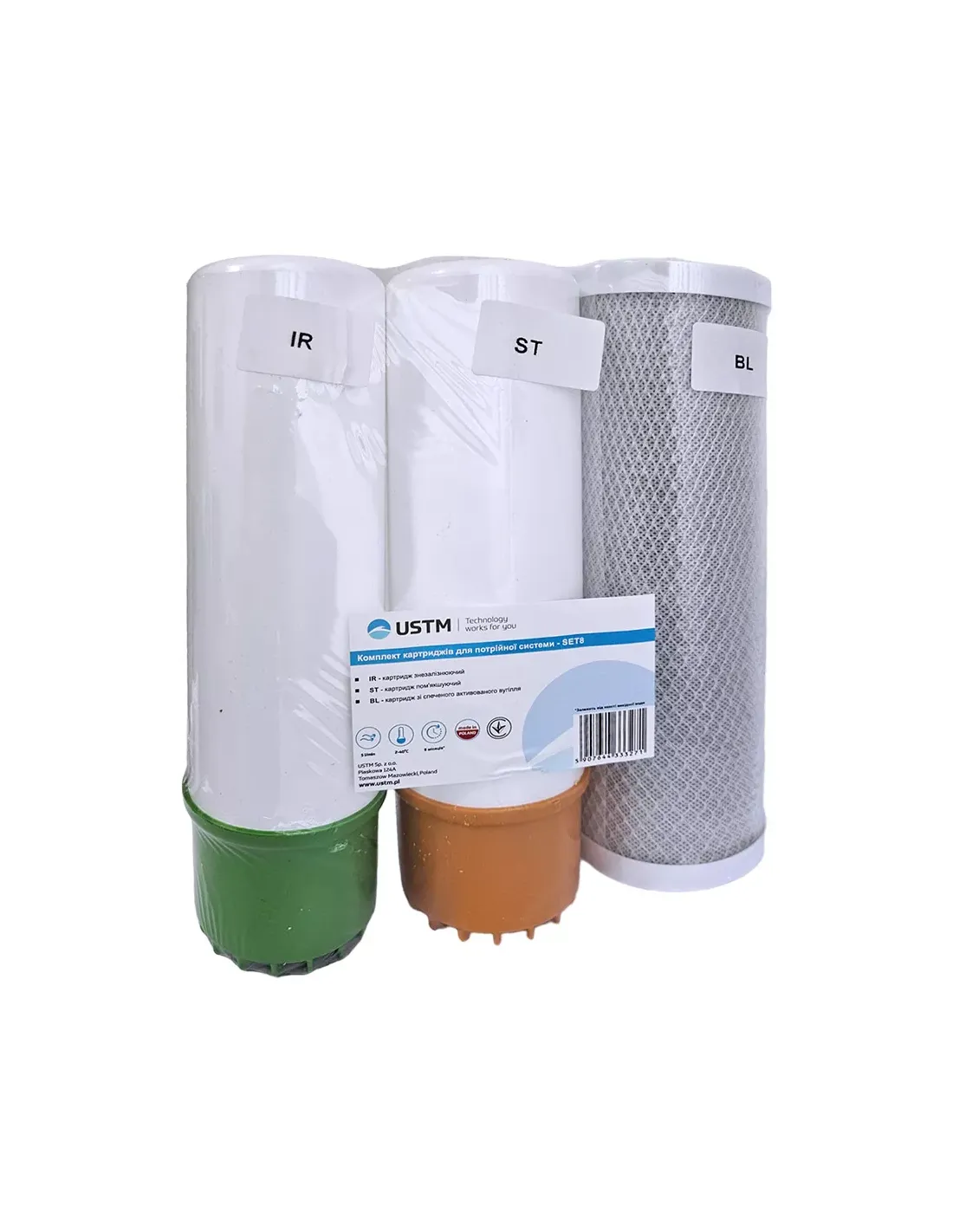 Комплект картриджів для фільтра USTM SET8 є системою зі змінних поліпропіленового та двох вугільних картриджів. Призначений для попереднього очищення води та видалення окисленого заліза (іржі), частинки мулу, глини, піску, мікроорганізмів, волокна торфу, шкідливих органічних сполук та хлору. Використовується в проточних фільтрах очищення води та системах зворотного осмосу. Незамінний у квартирах та приватних, заміських, дачних будинках, котеджах. Значно покращує смакові якості води, видаляючи неприємний присмак та сторонні запахи.