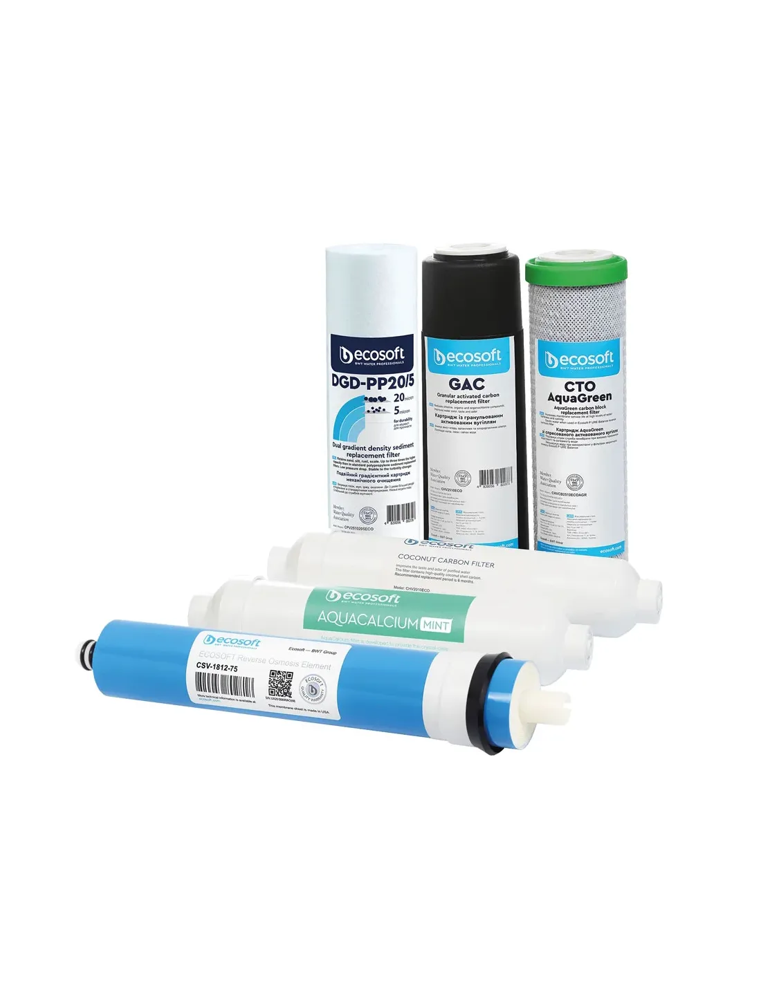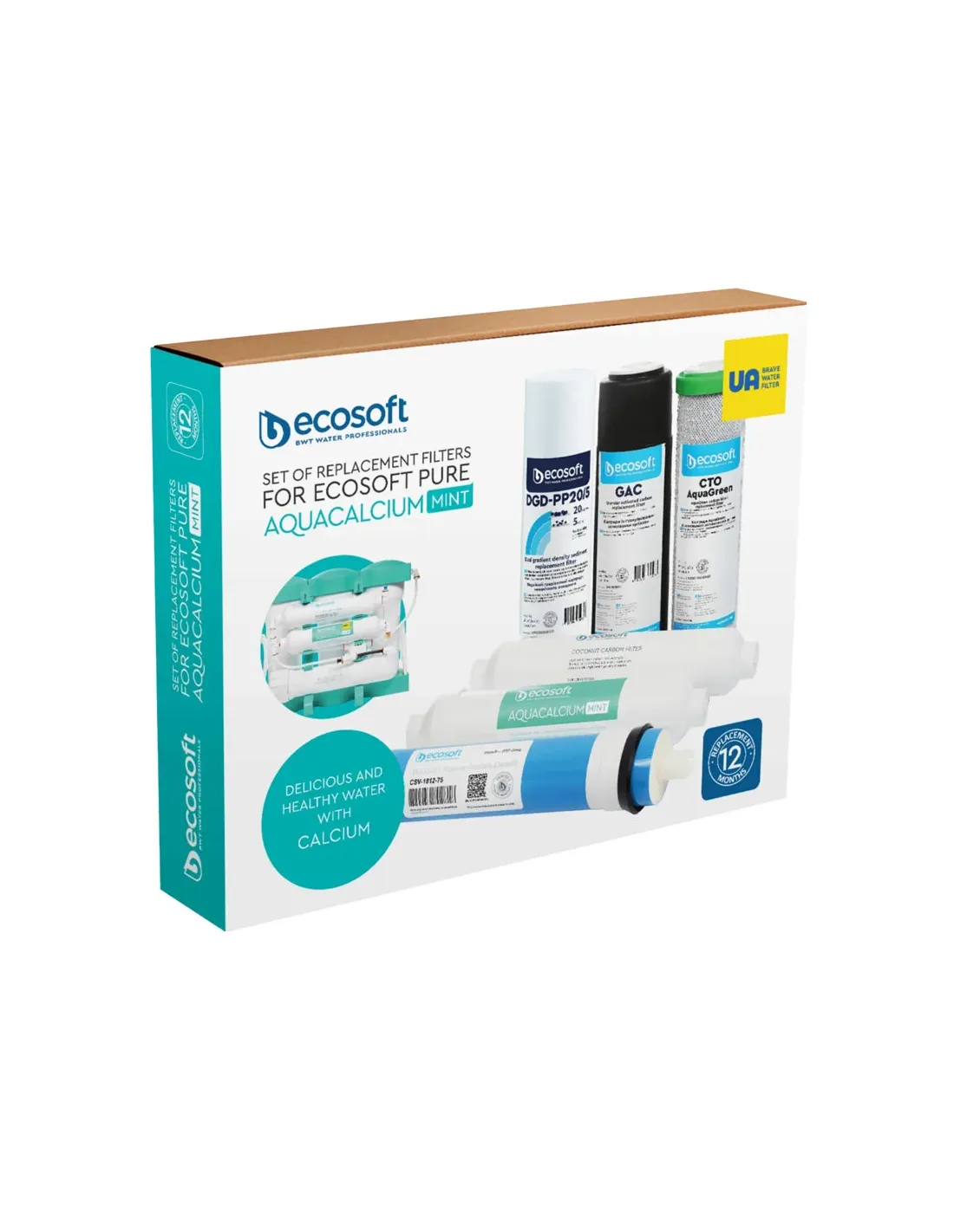 Комплект картриджів Ecosoft P`URE AquaCalcium складається із шести стадій очищення: 1-а стадія: механічний фільтр 20/5 мкм із пінного поліпропілену — видаляє пісок, іржу, мул та інші тверді частинки. 2-я стадія: гранульоване активоване вугілля GAC - усуває хлор, органіку, сторонні запахи та смак. 3-я стадія: брикетоване вугілля AquaSpring – видаляє хлорорганічні сполуки та знижує концентрацію важких металів. 4-я стадія: мембранний елемент - основний компонент фільтра зворотного осмосу, що видаляє розчинені солі, органічні речовини, важкі метали, бактерії та віруси. 5-та стадія: постфільтр – покращує смак і доочищує воду. 6-та стадія: мінералізатор AquaCalcium – насичує воду кальцієм і робить її смак м`яким та приємним. Заміна комплекту картриджів повинна проводитись кожні 12 місяців. Фактичний термін служби залежить від якості вихідної води.
