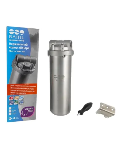 Комплект для фільтр-колби Raifil HMS-10B Slim 10 дюймів, 1 дюйм – пристрій для попереднього очищення води у системах водопостачання та водопідготовки. Він застосовується для видалення піску, іржі, мулу та інших великих нерозчинних частинок. Забезпечує тривалий термін служби трубопроводів, замикаючої та контролюючої арматури, теплообмінного обладнання. Витримує великий тиск та забезпечує високу швидкість очищення води - 1,2 м3/година.