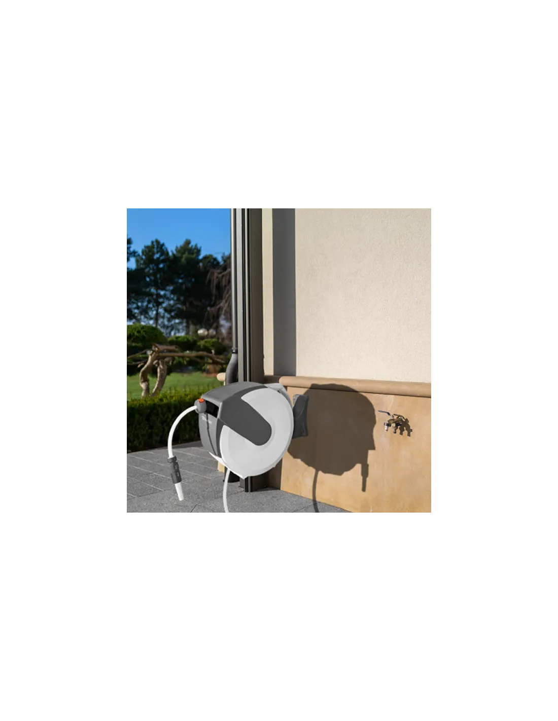 Монтаж здійснюється на стіну за допомогою знімного шпинделя та поворотного кронштейна, який забезпечує обертання на 180 градусів і дозволяє спрямовувати котушку у бік розмотування шланга. Комплект повністю готовий до використання та включає шланг, фітинги з протиковзким покриттям TPR та всі необхідні елементи для монтажу.