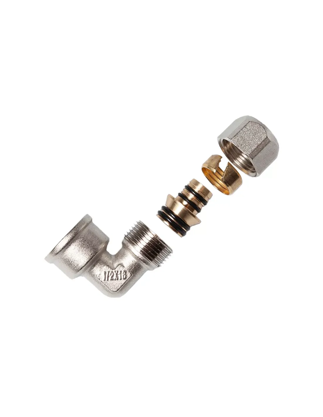 Куточок для металопластикової труби ITAL РВ 20х3/4 дюйма призначений для з`єднання металопластикових труб, при монтажі систем водопостачання та опалення, та для з`єднання з іншими елементами системи (трубопровідною арматурою), за допомогою трубної різьби. Стійкість кріплення між трубою та фітингом гарантується одночасною наявністю двох ущільнювальних кілець, розташованих у ялинці та особливою, протиковзною формою самої ялинки (у вигляді зубів пили). Кріплення труби відбувається за рахунок особливого виду пресування, що складається з радіального пресування, отриманого за рахунок загвинчування гайки, яка визначає стиск розрізаної оживальної частини навколо труби та осьового пресування, яке стискає кільце ущільнювача на корпусі. Подібна система пресування гарантує стійкість отриманого з`єднання будь-яких умов роботи. Крім того, працюючи на латуні в пресуванні, виключаються ризики виникнення мікротріщин. Наявність шайби з PTFE ізолює алюміній труби від фітингу латуні для уникнення виникнення корозійних ефектів.