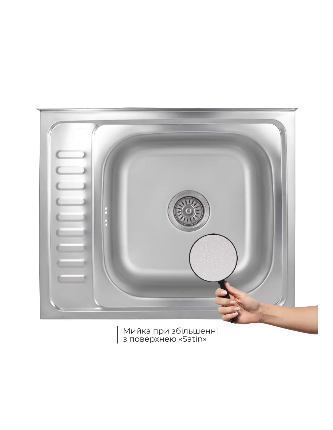 Мойка для кухни прямоугольная Brinex 6050-R из нержавеющей стали - предназначена для использования на кухне для мытья посуды. Данная мойка это образец качества, презентабельного внешнего вида и долговечности. Она очень практична, способна прослужить много лет, сохраняя изначальные декоративные и технические показатели на протяжении всего срока службы. Мойка изготовлена в самой популярной прямоугольной форме. Мойка произведена с одной чашей и небольшим крылом для сушки посуды. Благодаря глубине 16 см в ней можно поместить большое количество посуды, без проблем набрать большую емкость воды, а наличие небольших бортиков на мойке не дадут каплям воды попасть на столешницу. Данная модель с легкостью выдерживает тяжелый вес продуктов и кухонных приспособлений.