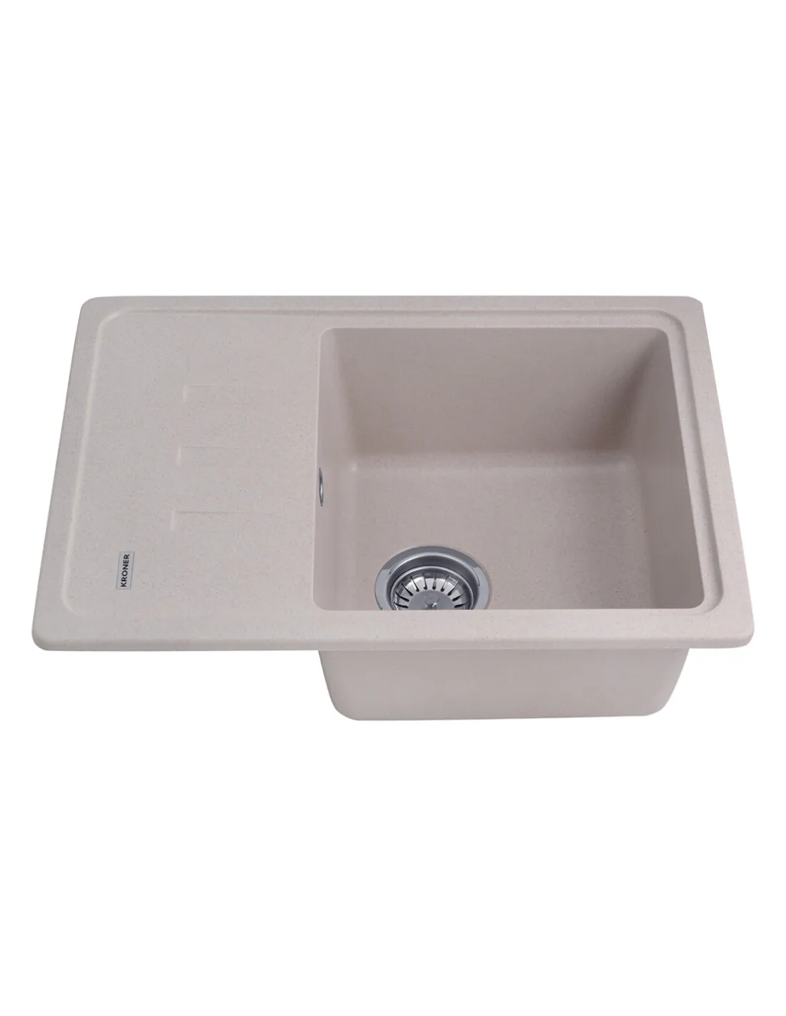 Мойка для кухни Kroner KRP Komposit COL - 6243 песочного цвета из искусственного камня предназначена для использования на кухне для мытья посуды. Данная мойка – это сочетание современного дизайна, надежности и долговечности. Она практична и устойчива к внешним воздействиям, сохраняя первоначальный внешний вид и характеристики в течение всего срока службы. Мойка имеет приятный песочный оттенок и матовую поверхность, которая не теряет цвет под действием солнечных лучей. Изготовлена в популярной прямоугольной форме с одной глубокой чашей и универсальным крылом для сушки посуды. Глубина чаши 22 см позволяет комфортно мыть большое количество посуды, а бортики предотвращают стекание воды на столешницу.