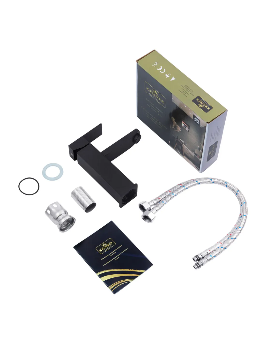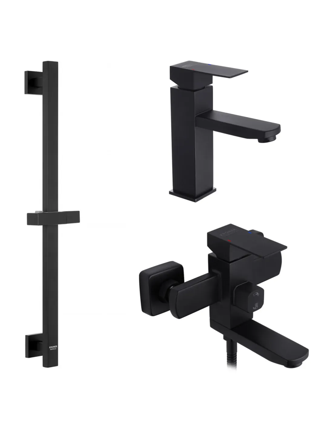 Набір змішувачів для ванни Kroner змішувач Edelstahl Kubus-SCH060 та змішувач для раковини Edelstahl Kubus-SCH010 зі штангою для душу Edelstahl Kubus-SCH230 призначений для стильного та функціонального оснащення ванної кімнати. Використовується для подачі води на раковину, ванну та душ, з можливістю змішування гарячої та холодної води у заданій пропорції. В комплект входять змішувач для ванни, змішувач для раковини, штанга для душу, лійка для ручного душу, душовий шланг та кронштейн для лійки. Виготовлені із харчової нержавіючої сталі SUS304 з матовою чорною поверхнею. Управління одноважільне на картриджному механізмі. Гарантія на змішувач для ванни – 120 місяців, змішувач для раковини – 60 місяців, на штангу для душу – 36 місяців. Країна-виробник – Чехія.