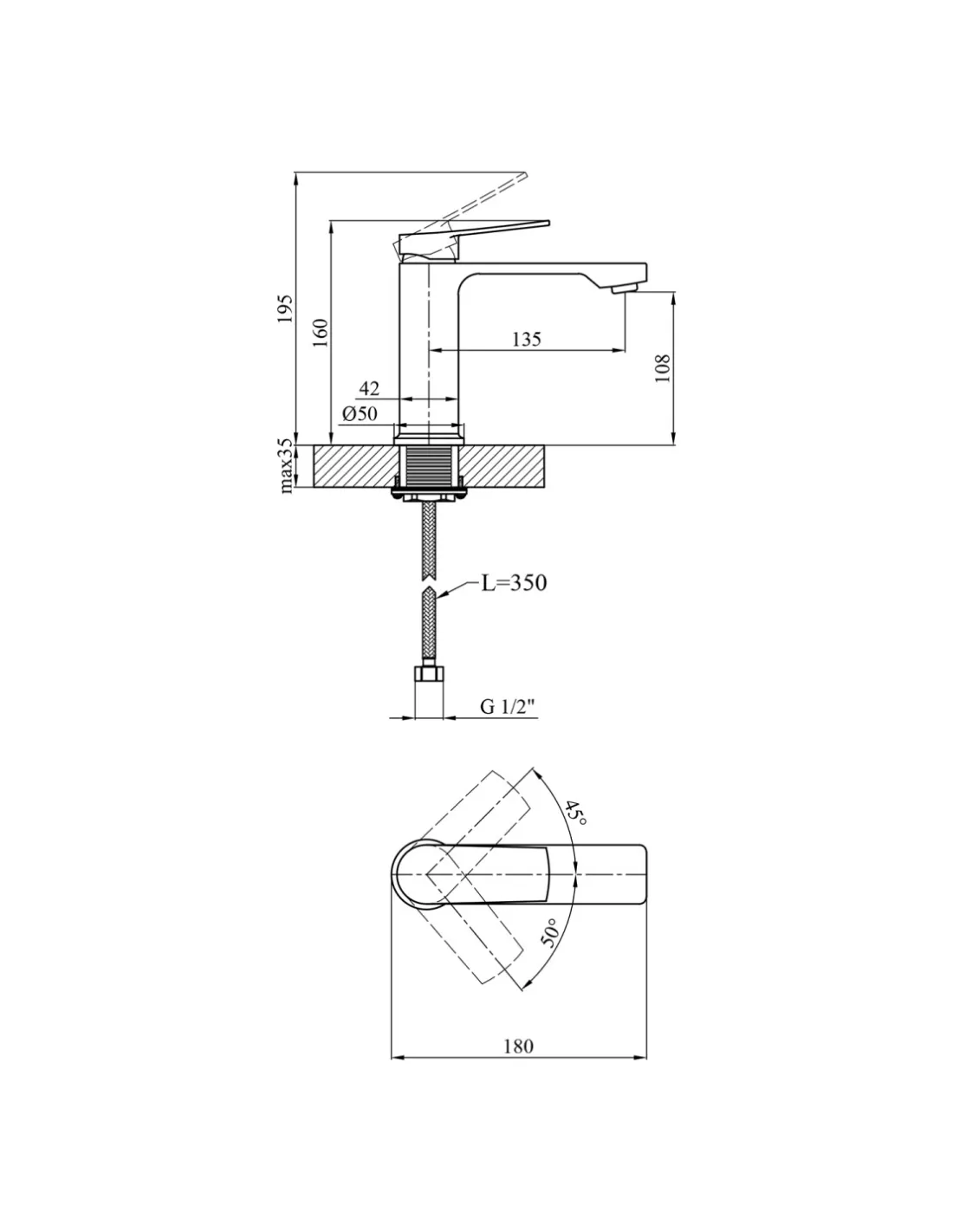 - Змішувач для раковини, висота 160 мм, довжина виливу 135 мм,