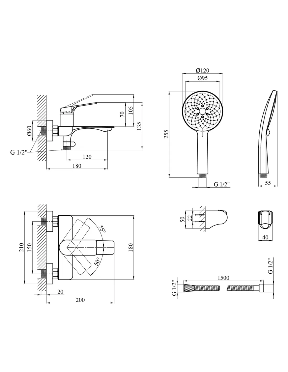 - Душевой гарнитур: 3 режима струи, лейка круглая 120 мм, система предотвращения скручивания шланга,