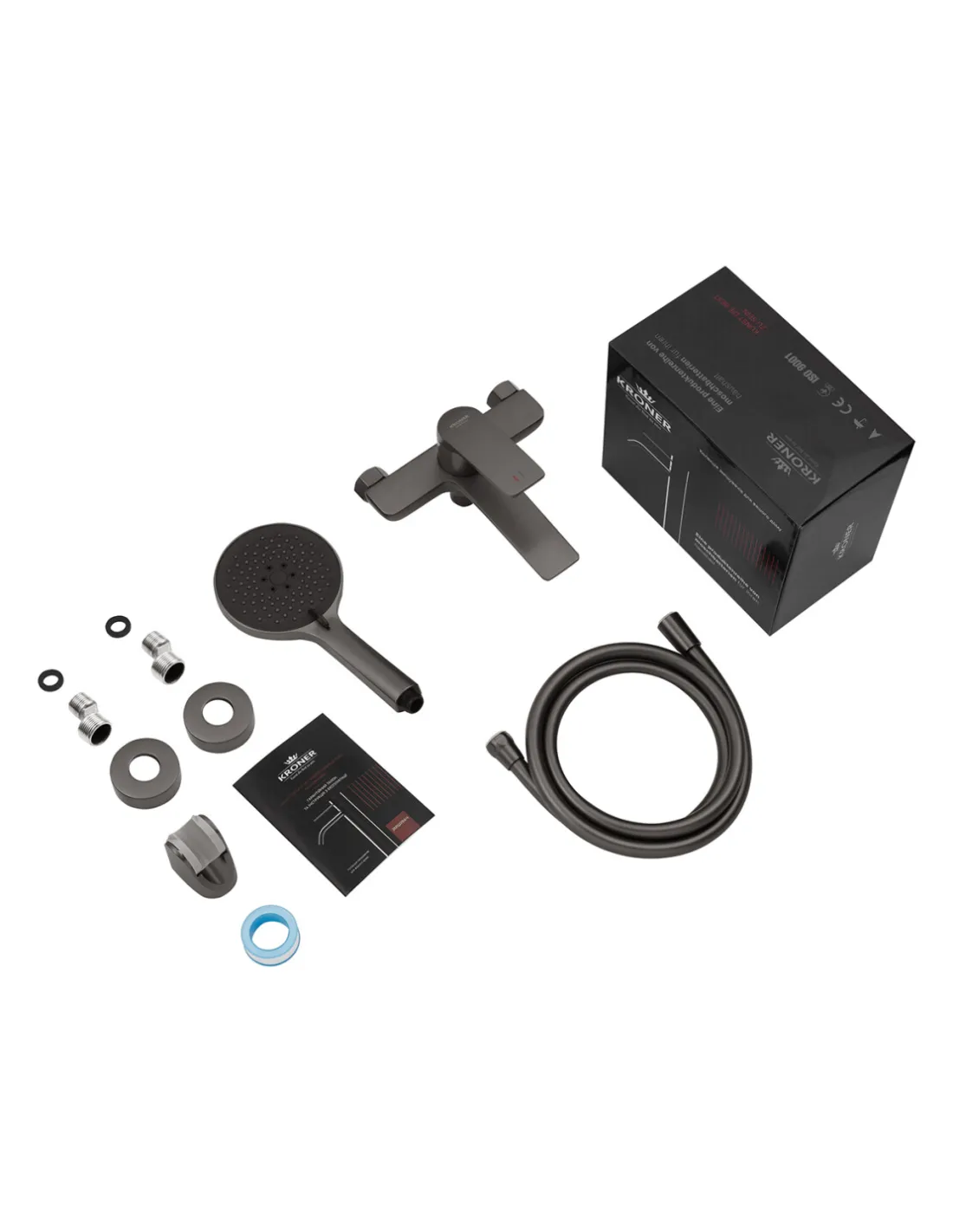 Набор смесителей для ванны Kroner смеситель Graz-GRP060 и смеситель для раковины Graz-GRP010 с душевым набором предназначен для стильного и функционального оснащения ванной комнаты. Используется для подачи воды на ванну и раковину с возможностью смешивания горячей и холодной воды. В комплект входят смеситель для ванны, смеситель для раковины, лейка для ручного душа, душевой шланг (1500 мм), кронштейн для лейки, гибкая подводка, крепежи и инструкция. Изготовлены из высококачественной латуни с глянцевым графитовым покрытием. Управление однорычажное на картриджном механизме. Гарантия на смесители – 60 месяцев. Страна производитель – Чехия.