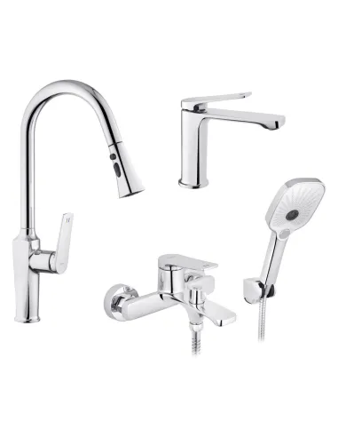 Набор смесителей для ванны Kroner смеситель Makon-C060, смеситель для кухни Makon-C030-T и смеситель для раковины Makon-C010 предназначен для решения задачи единого стиля и надежной подачи воды в ванной комнате и на кухне. Используется для смешивания горячей и холодной воды в нужной пропорции и подачи на ванну, раковину и кухонную мойку. Состоит из смесителя для ванны (высота 125 мм, длина излива 130 мм), смесителя для кухни (высота 470 мм, длина излива 230 мм), смесителя для раковины (высота 160 мм, длина излива 135 мм), лейки для ручного душа, душевого шланга и держателя для ручной лейки. Набор изготовлен из прочной латуни с глянцевым хромированным покрытием. Управление однорычажное, картриджное. Гарантия: смеситель для ванны и кухни - 60 месяцев, смеситель для раковины - 60 месяцев. Страна производитель - Чехия.
