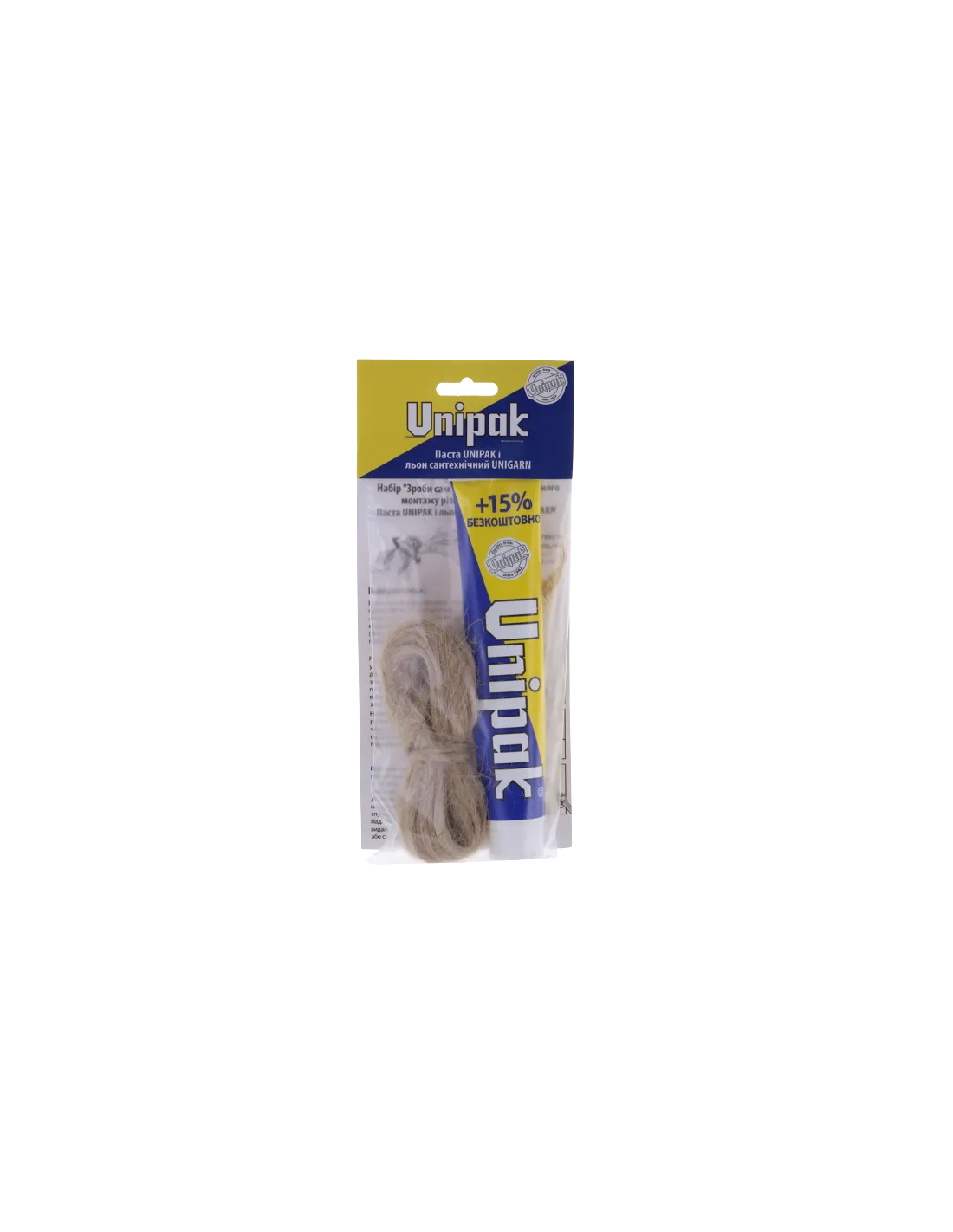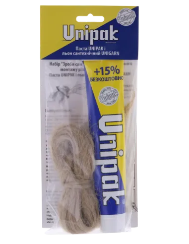 Набор уплотнительный Unipak Unigarn паста 65 г и льняные волокна 13 г - представляют собой натуральное средство для герметизации сантехнических соединений. Льняные волокна обеспечивают надежную герметизацию и защиту от протечек, а также экологическую безопасность.