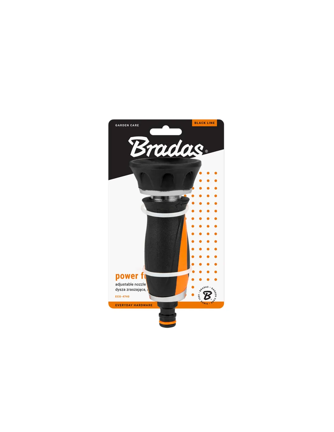 Насадка-розпилювач Bradas Power Full Black Line ECO-4740 - призначена для ручного поливу рослин, клумб, грядок, дерев, зрошення садових та присадибних ділянок. Має плавне регулювання: від потужного спрямованого струменя до дрібнодисперсного розпилення у вигляді «парасольки». Відрізняється простою та надійною конструкцією, розрахованою на тривале використання.