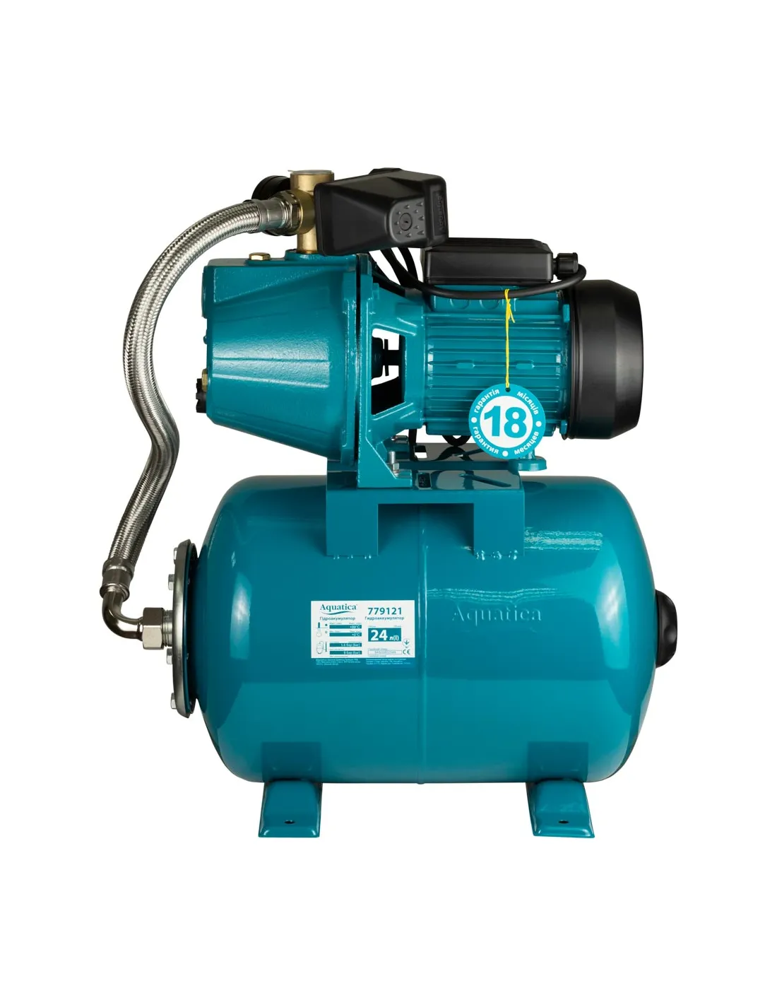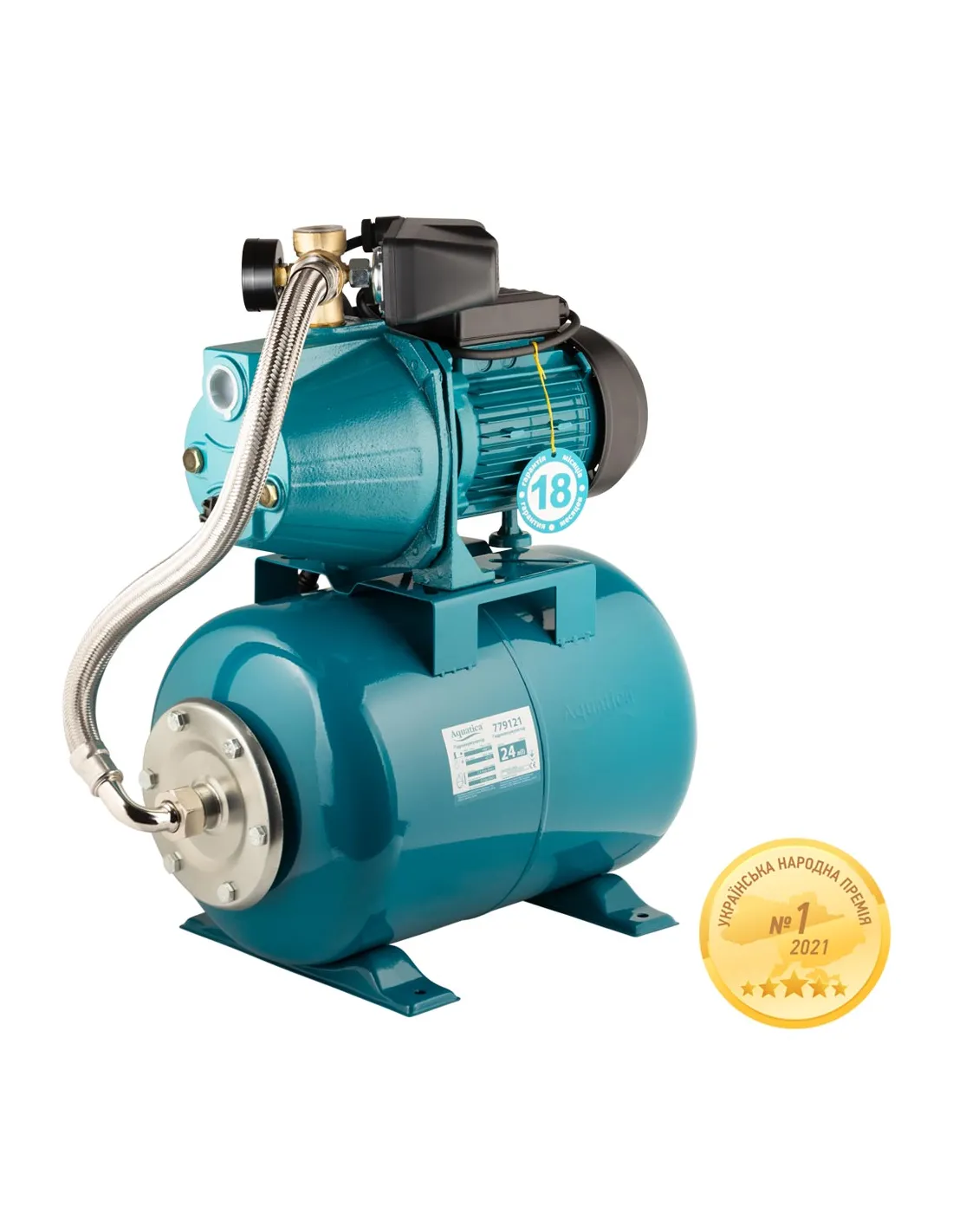 Насосна станція Aquatica 775093/50 призначена для автоматичної подачі води для зрошення, поливу та побутового водопостачання з відкритих джерел та свердловин. Потужність двигуна 1,1 квт. Джерело живлення 220 Вольт (однофазний). Матеріал виробу насоса – чавун, робоче колесо – технополімер. Максимальна глибина підйому води до 9 метрів. Максимальний тиск: 55 метрів. Продуктивність насосної станції – 4,8 куб.м/година або 80 літрів за хвилину. Об`єм гідроакумулятора 50 літрів. Матеріал виробу гідроакумулятора – вуглецева сталь. Автоматика, що використовується, з механічним реле. Гарантія 24 місяці. Країна виробник - Китай.