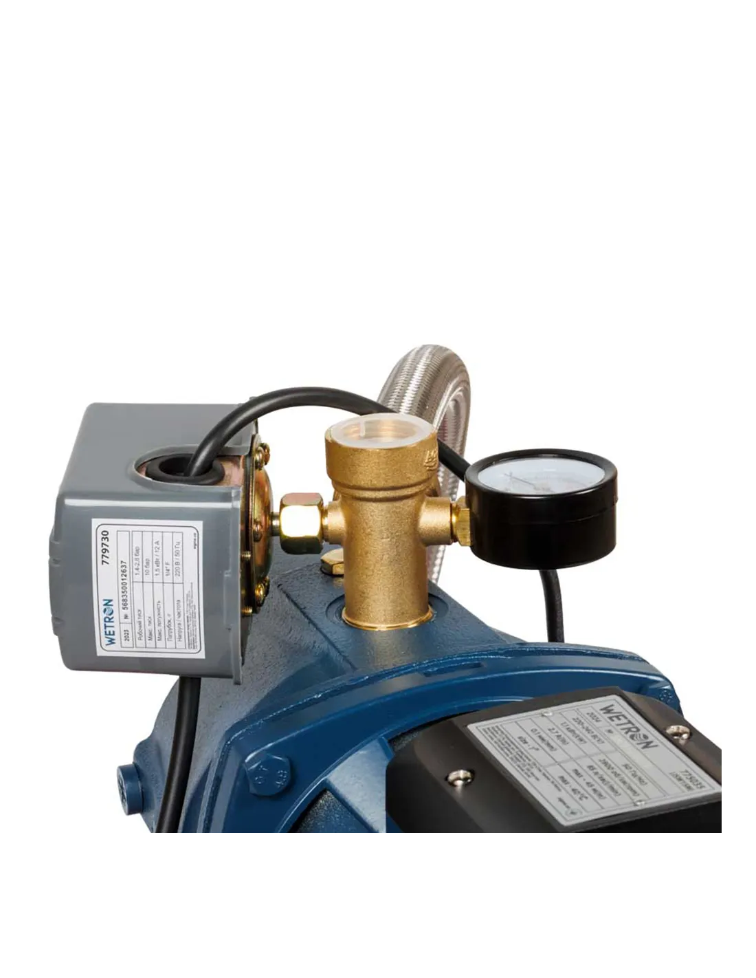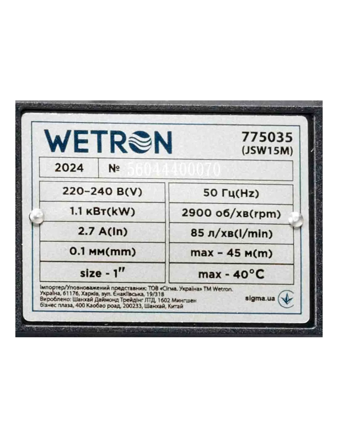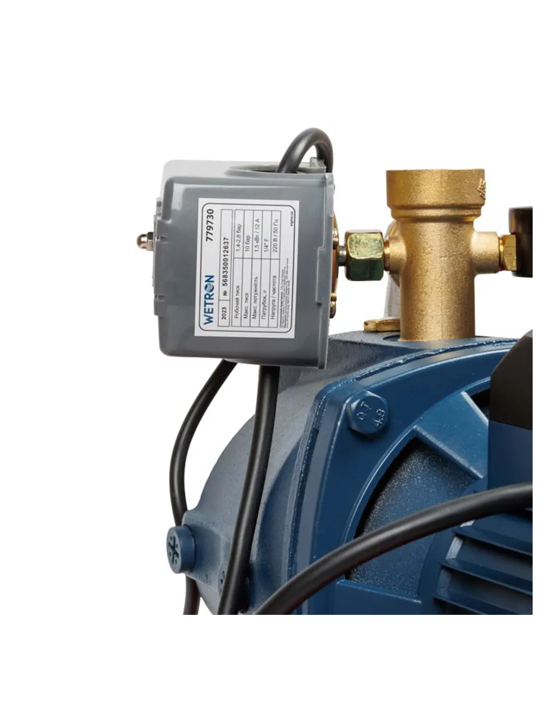 Насосна станція Wetron 775035/50 призначена для автоматичної подачі чистої води з колодязів та свердловин для побутових потреб та поливу. Потужність двигуна 1,1 квт. Джерело живлення 220 Вольт (однофазний). Матеріал виробу насоса - чавун, робоче колесо виконане з латуні. Максимальна глибина підйому води до 8 метрів. Максимальний тиск: 45 метрів. Продуктивність насосної станції – 3,6 куб.м/година або 60 літрів на хвилину. Об`єм гідроакумулятора 50 літрів. Матеріал виробу гідроакумулятора – вуглецева сталь. Автоматика, що використовується, з механічним реле. Гарантія 24 місяці. Країна виробник - Китай.
