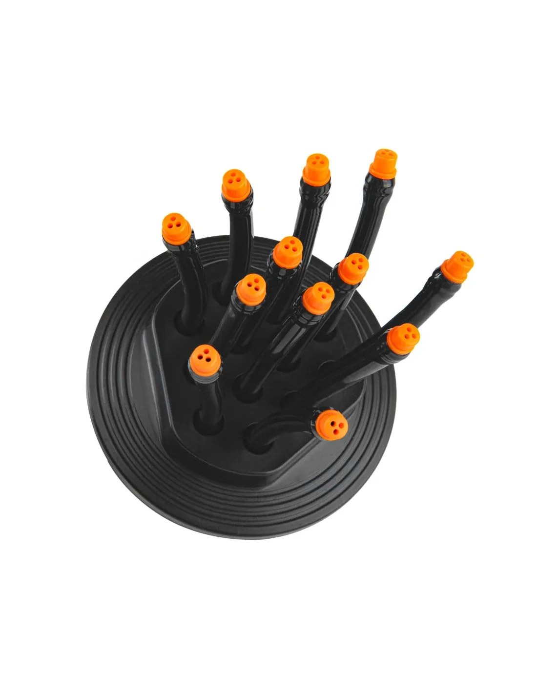 Ороситель Bradas Hydra Black Line, ECO-1082K - статический ороситель на колышке с регулируемой зоной полива от 0 до 360 градусов. Состоит из 12 регулируемых кронштейнов с форсунками, которые под давлением воды распыляют ее равномерно по всему участку. Применяется для эффективного полива полей, газонов, грядок и тому подобное.