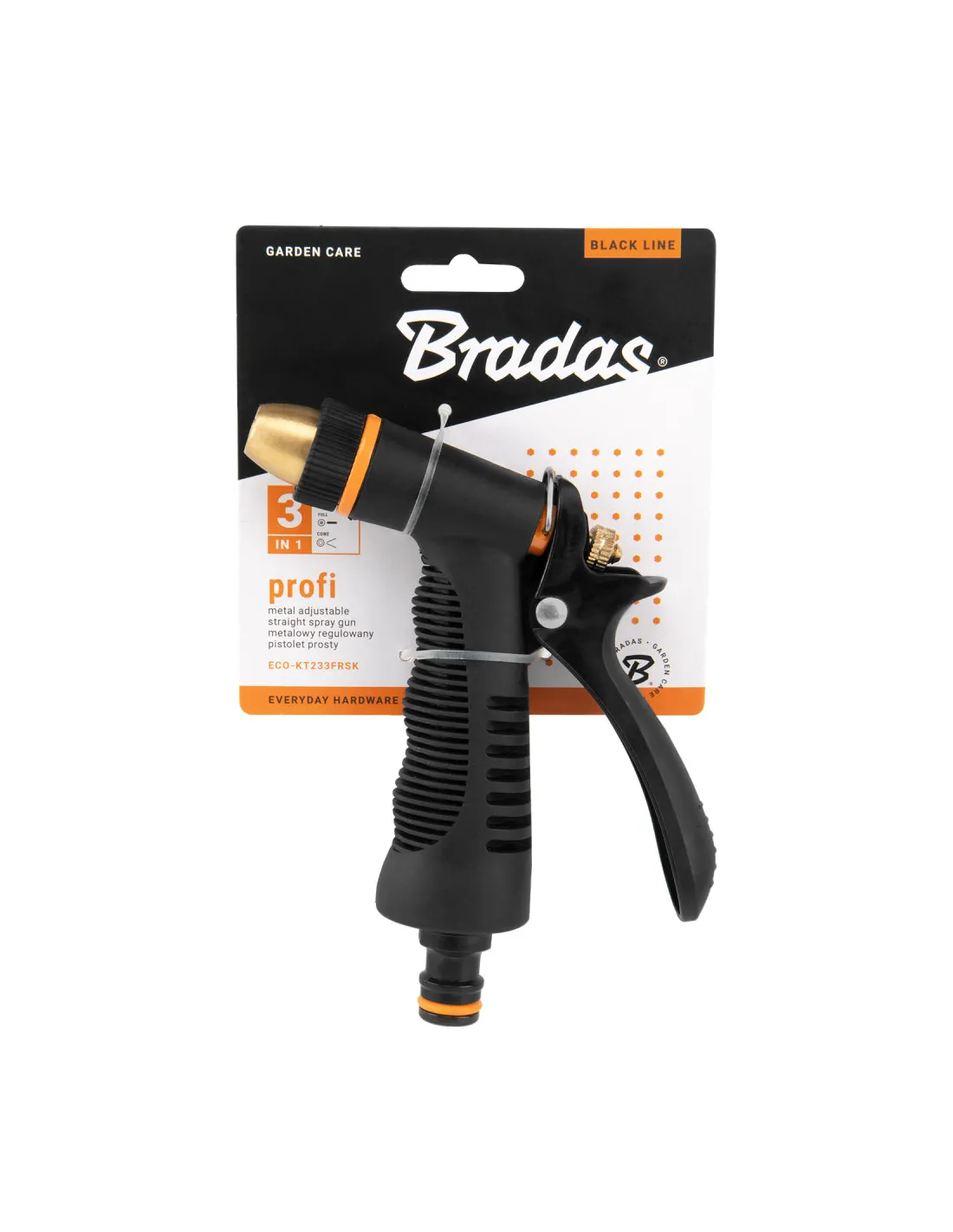 Пістолет для поливу Bradas Profi Black Line ECO-KT233FRSK призначений для ручного поливу потрібних об`єктів. Використовується для поливу рослин, садів, городів, прибудинкової території та садової техніки. Пістолет має 3 режими розпилення води: струмінь, повний, туман. Оснащений важелем для плавного регулювання інтенсивності водяного потоку. Закінчується ніпелем для швидкого з`єднання. Гарантія на виріб 12 місяців, термін служби необмежений. Країна-виробник Польща.