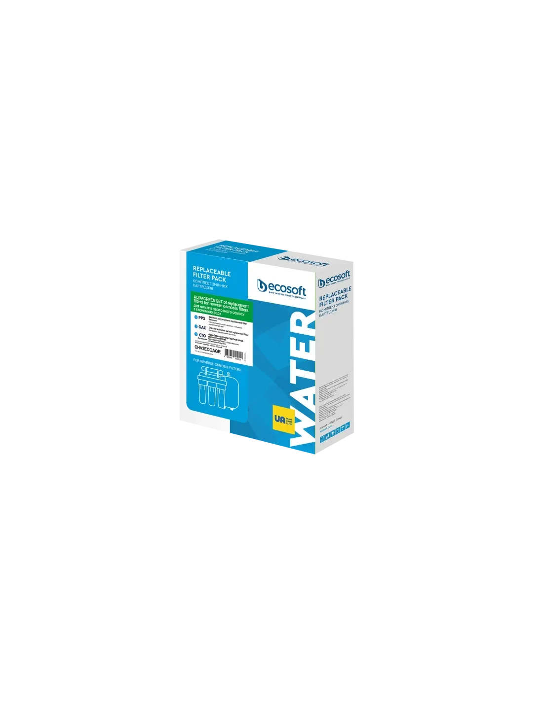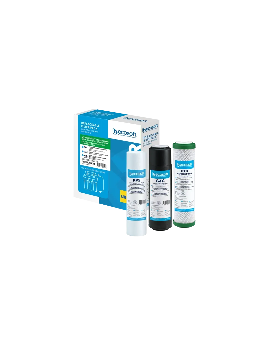 Комплект Ecosoft 1-2-3 CHV3ECOAGR включає три картриджі: механічного очищення 5 мкм, вугільний гранульований та вугільний пресований. Усі елементи виконані із безпечних матеріалів, призначених для контакту з питною водою. Використовуються лише для холодної води. Рекомендується замінювати комплект не рідше ніж один раз на 6 місяців. Після встановлення картриджів перші 10 літрів очищеної води необхідно злити у каналізацію.