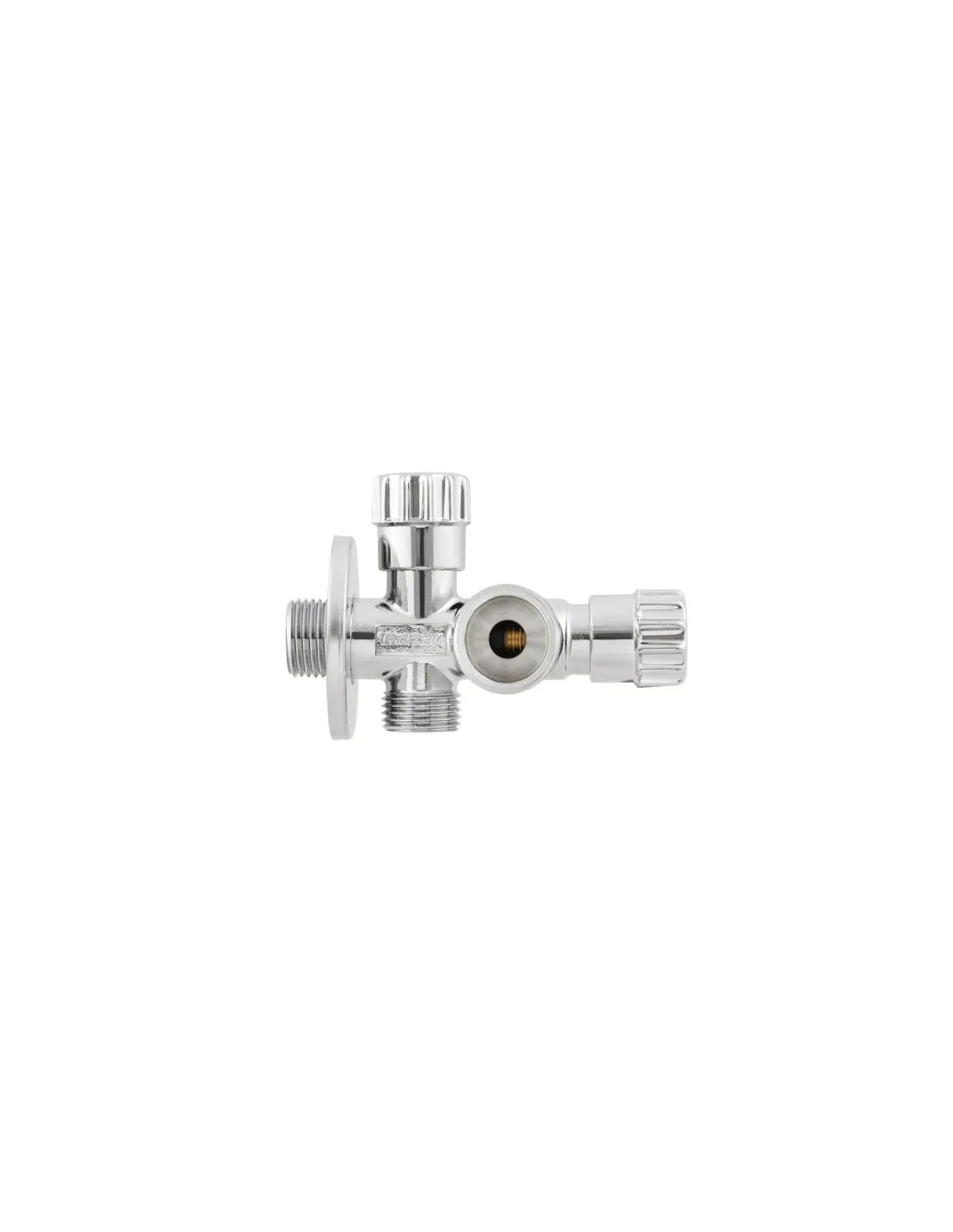 Приладовий кран кутовий Raftec VBE010102 1/2х1/2х3/4 дюйми, вентильний — комбінований кран-трійник, розроблений для підключення змішувача та пральної або посудомийної машини до одного виводу водопроводу. Різні діаметри виходів (1/2" і 3/4") виключають необхідність використання додаткових перехідників. ванною.
