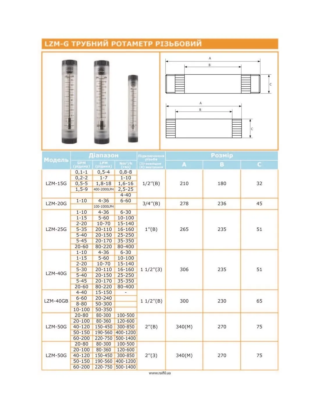 Технічні характеристики ротаметра трубного типу Raifil LZM-50GB 60-200 GPM: