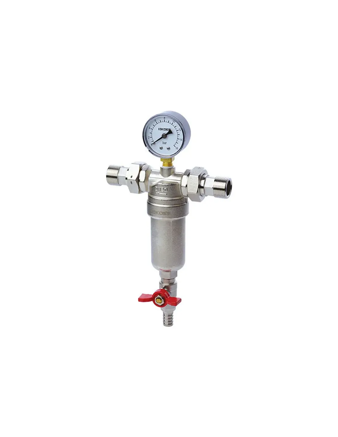 Самопромивний фільтр з манометром для гарячої води Koer KR.1250 призначений для очищення водяного потоку від механічних домішок. Передбачені дренажний кульовий кран зі штуцером для підключення шланга та манометр для контролю рівня забрудненості сіток. Застосовується в мережах холодного побутового та промислового водопостачання.