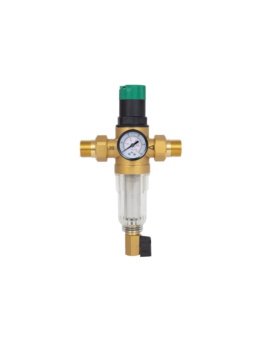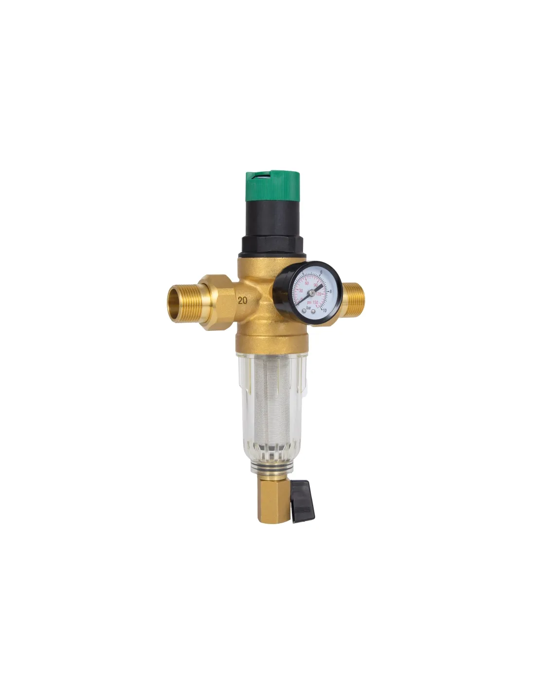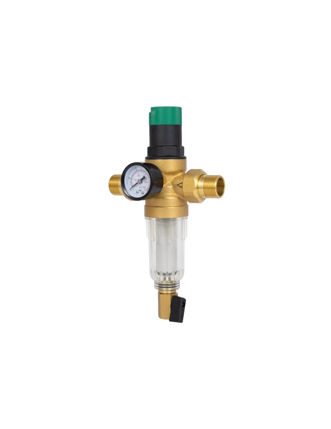 Цей фільтр повинен бути встановлений на горизонтальній ділянці трубопроводу зливним клапаном вниз, а напрямок потоку повинен відповідати напрямку стрілки на корпусі фільтра. Корпус та фітинги виготовлені з латуні, виріб укомплектований редуктором тиску та манометром зі шкалою вимірювань від 0 до 10 бар. Дренажний клапан зі шланговим штуцером дозволяє проводити як пряме, так і зворотне промивання фільтра.