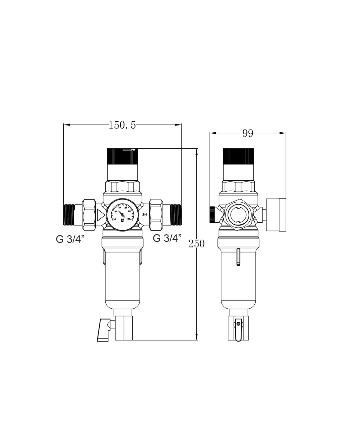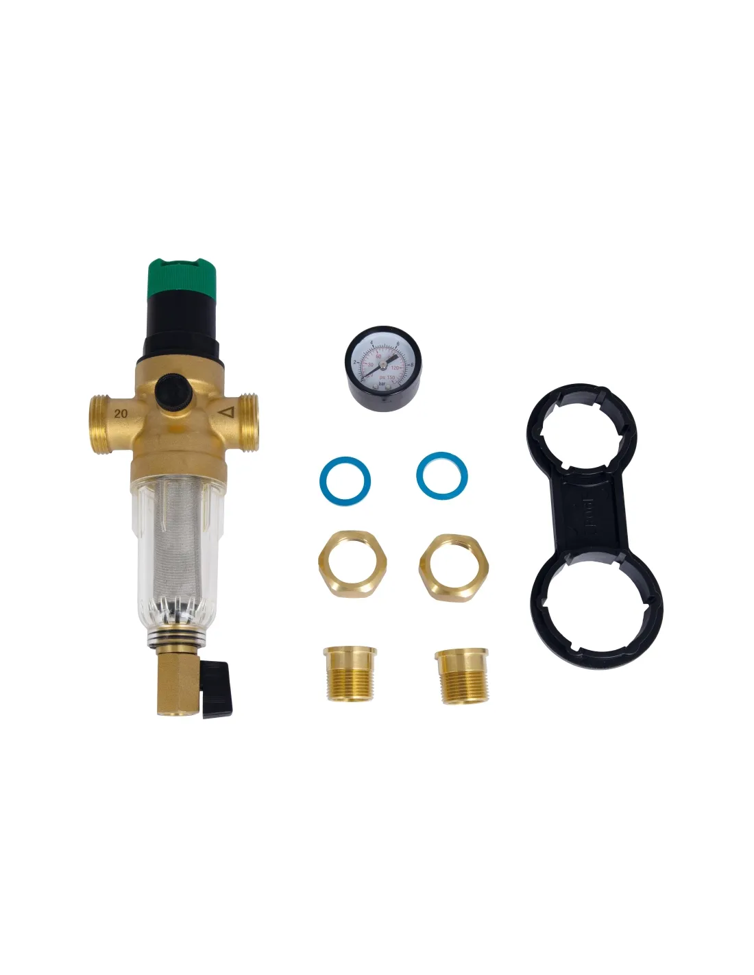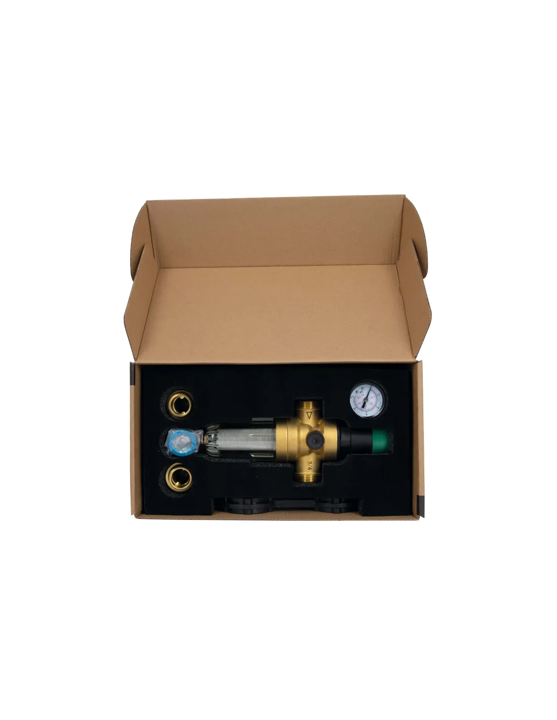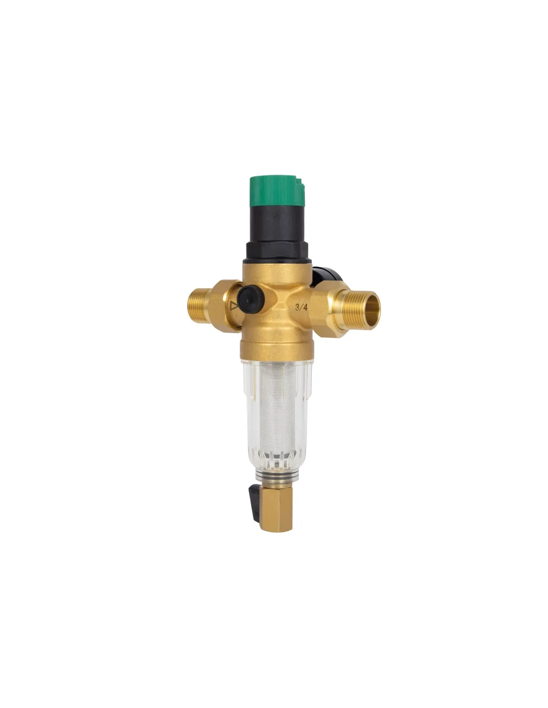 Цей фільтр повинен бути встановлений на горизонтальній ділянці трубопроводу зливним клапаном вниз, а напрямок потоку повинен відповідати напрямку стрілки на корпусі фільтра. Корпус та фітинги виготовлені з латуні, виріб укомплектований редуктором тиску та манометром зі шкалою вимірювань від 0 до 10 бар. Дренажний клапан зі шланговим штуцером дозволяє проводити як пряме, так і зворотне промивання фільтра.