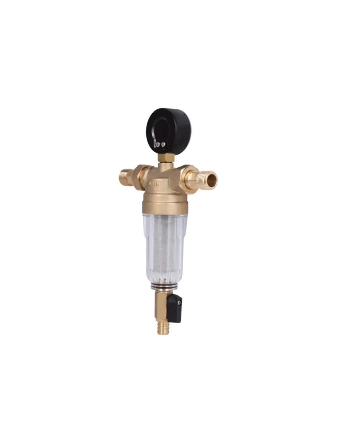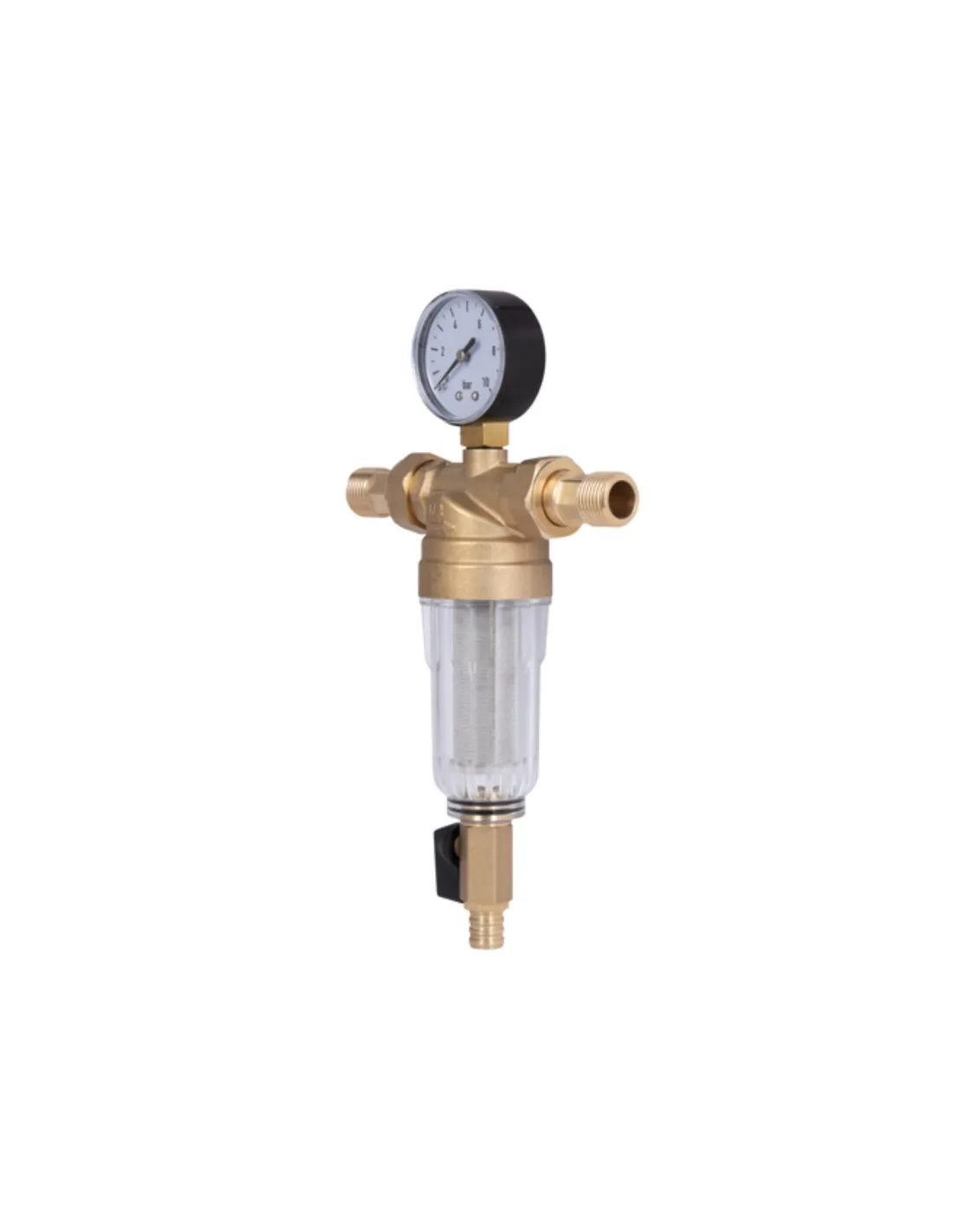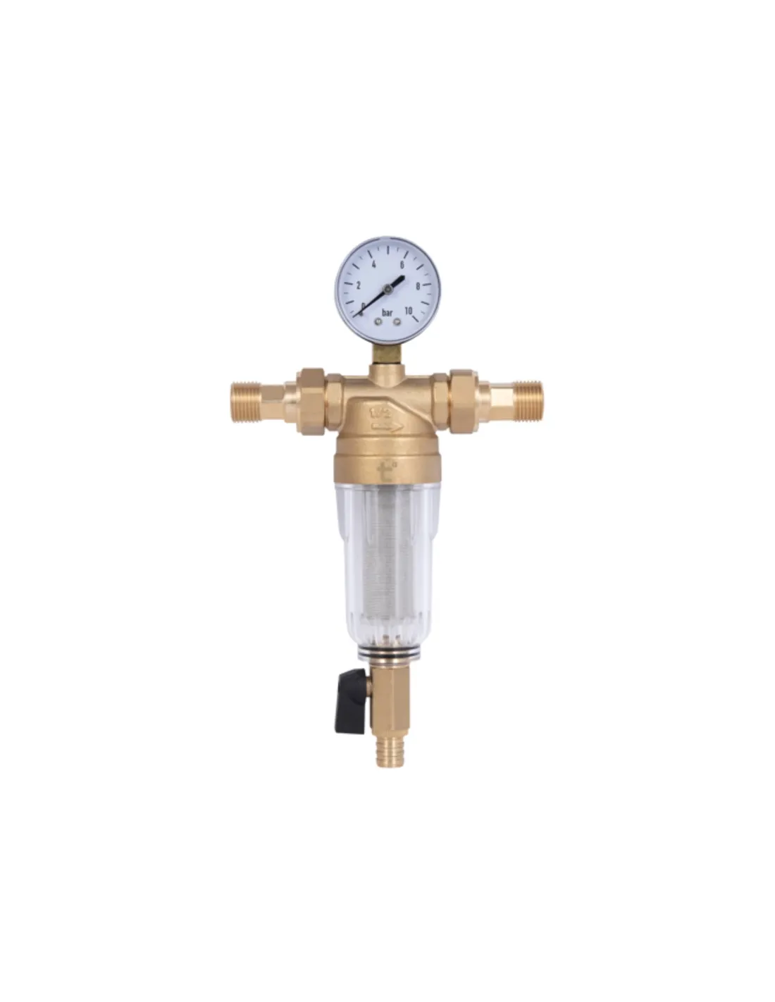 Цей фільтр повинен бути встановлений на горизонтальній ділянці трубопроводу зливним клапаном вниз, а напрямок потоку повинен відповідати напрямку стрілки на корпусі фільтра. Корпус та фітинги виготовлені з латуні, виріб укомплектований манометром зі шкалою вимірювань від 0 до 10 бар. Дренажний клапан зі шланговим штуцером дозволяє проводити як пряме, так і зворотне промивання фільтра.