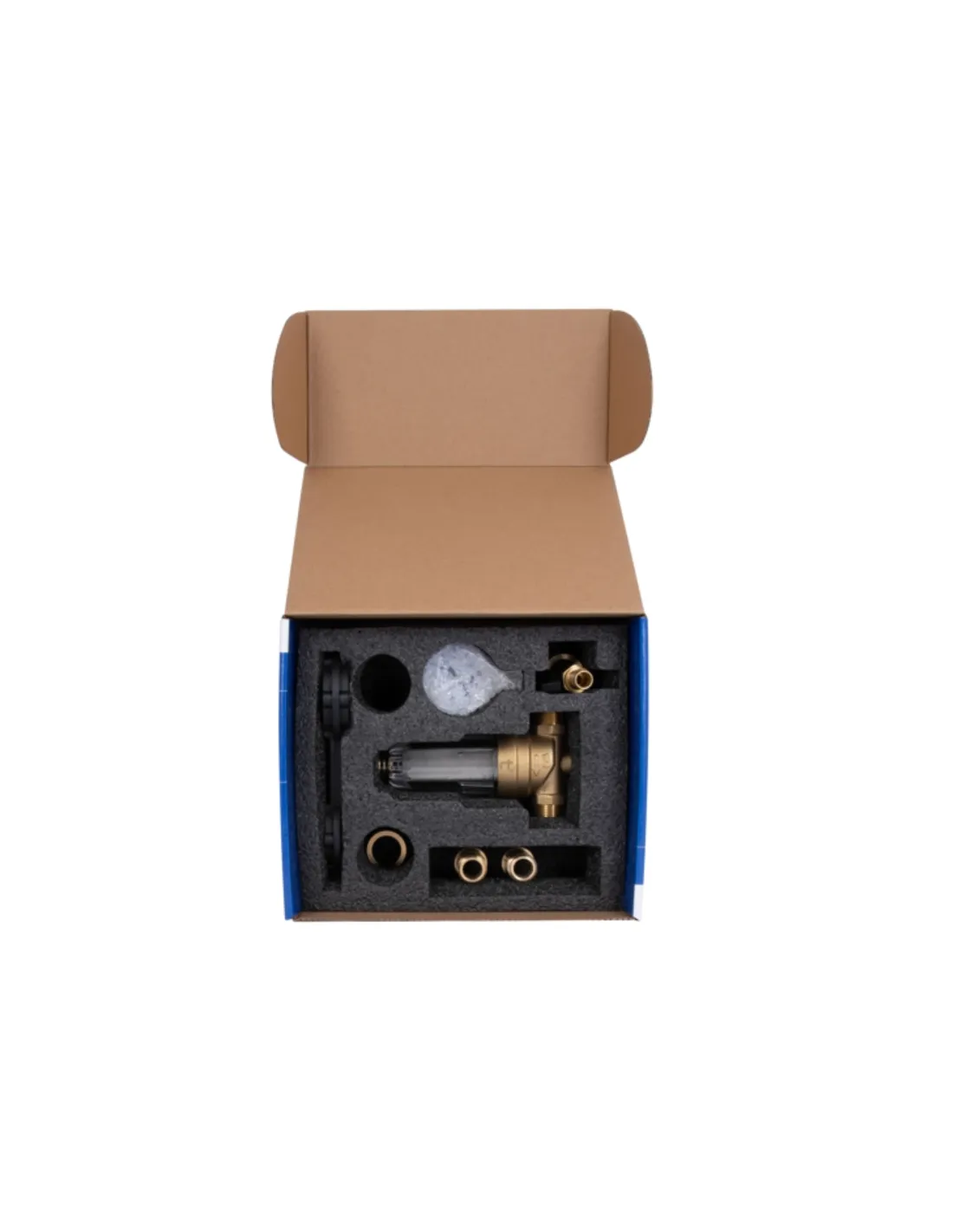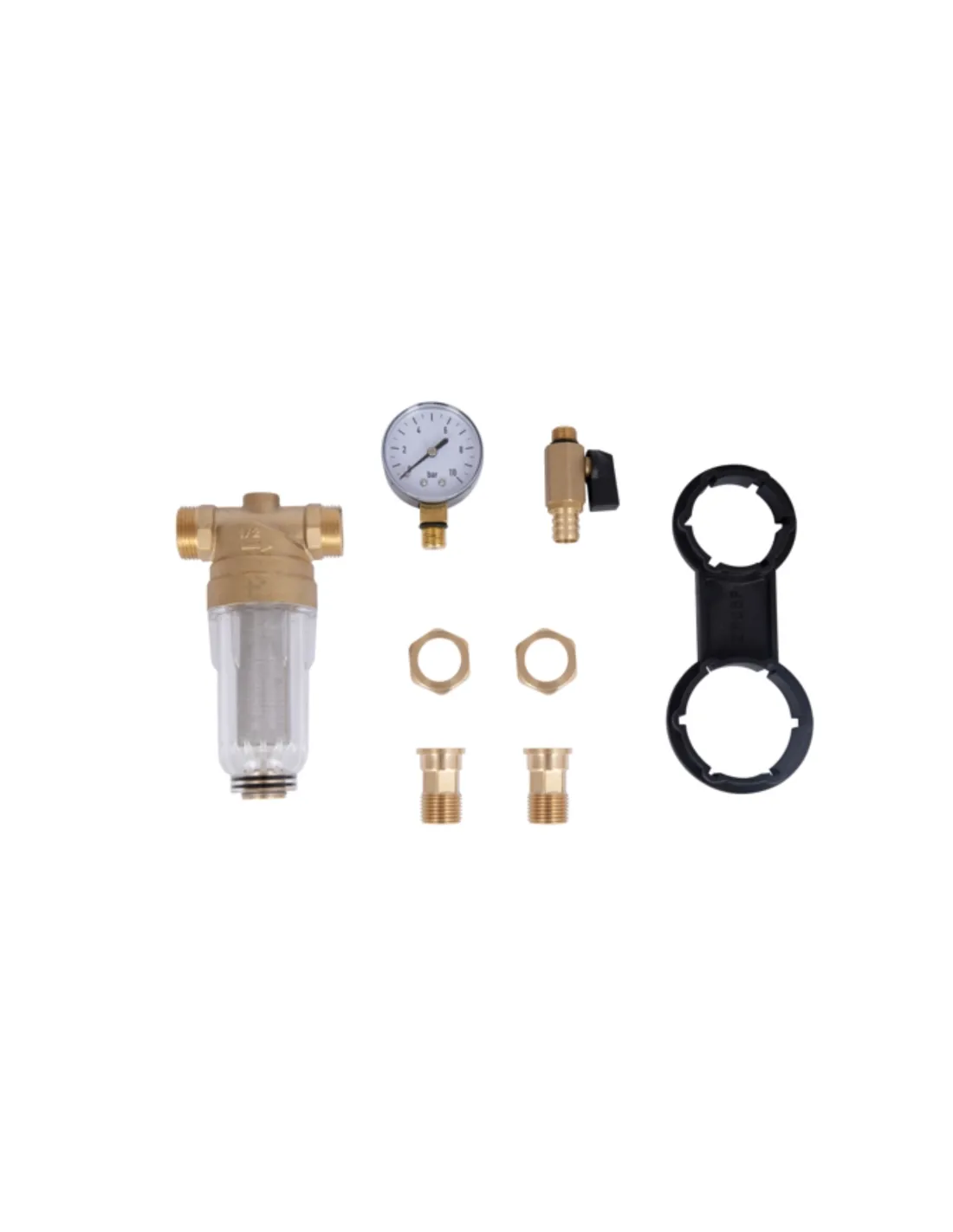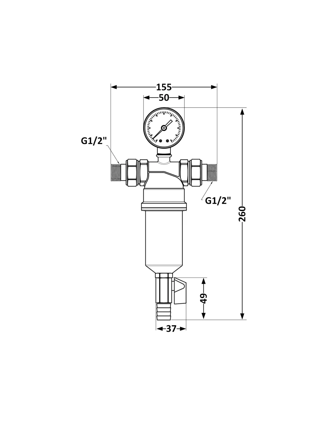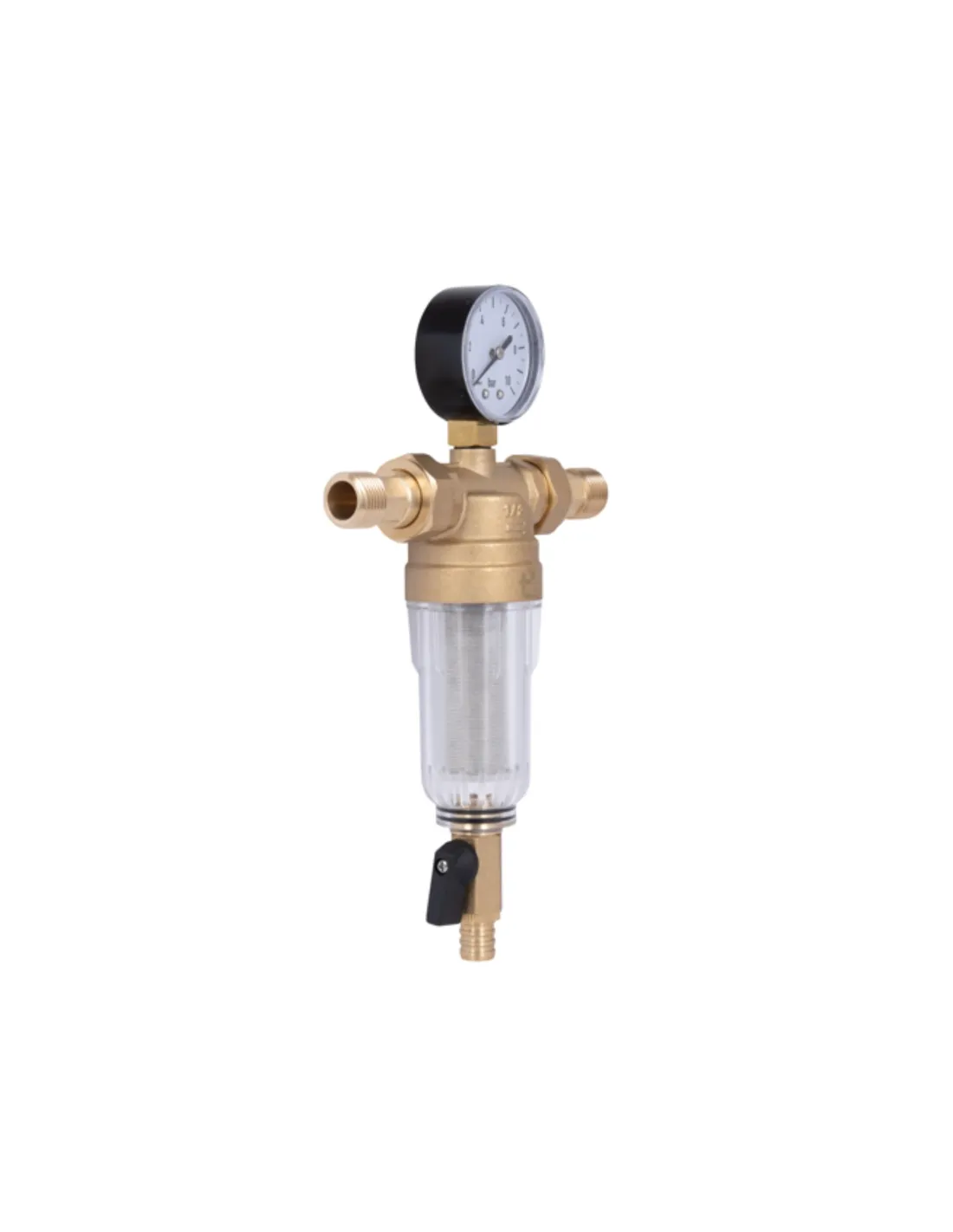 Цей фільтр повинен бути встановлений на горизонтальній ділянці трубопроводу зливним клапаном вниз, а напрямок потоку повинен відповідати напрямку стрілки на корпусі фільтра. Корпус та фітинги виготовлені з латуні, виріб укомплектований манометром зі шкалою вимірювань від 0 до 10 бар. Дренажний клапан зі шланговим штуцером дозволяє проводити як пряме, так і зворотне промивання фільтра.