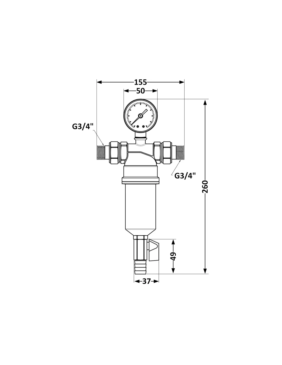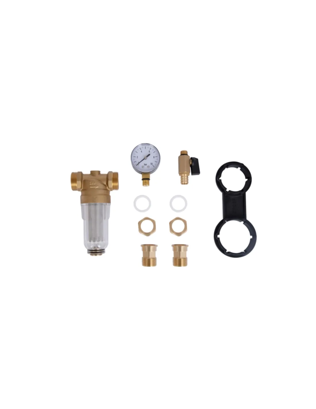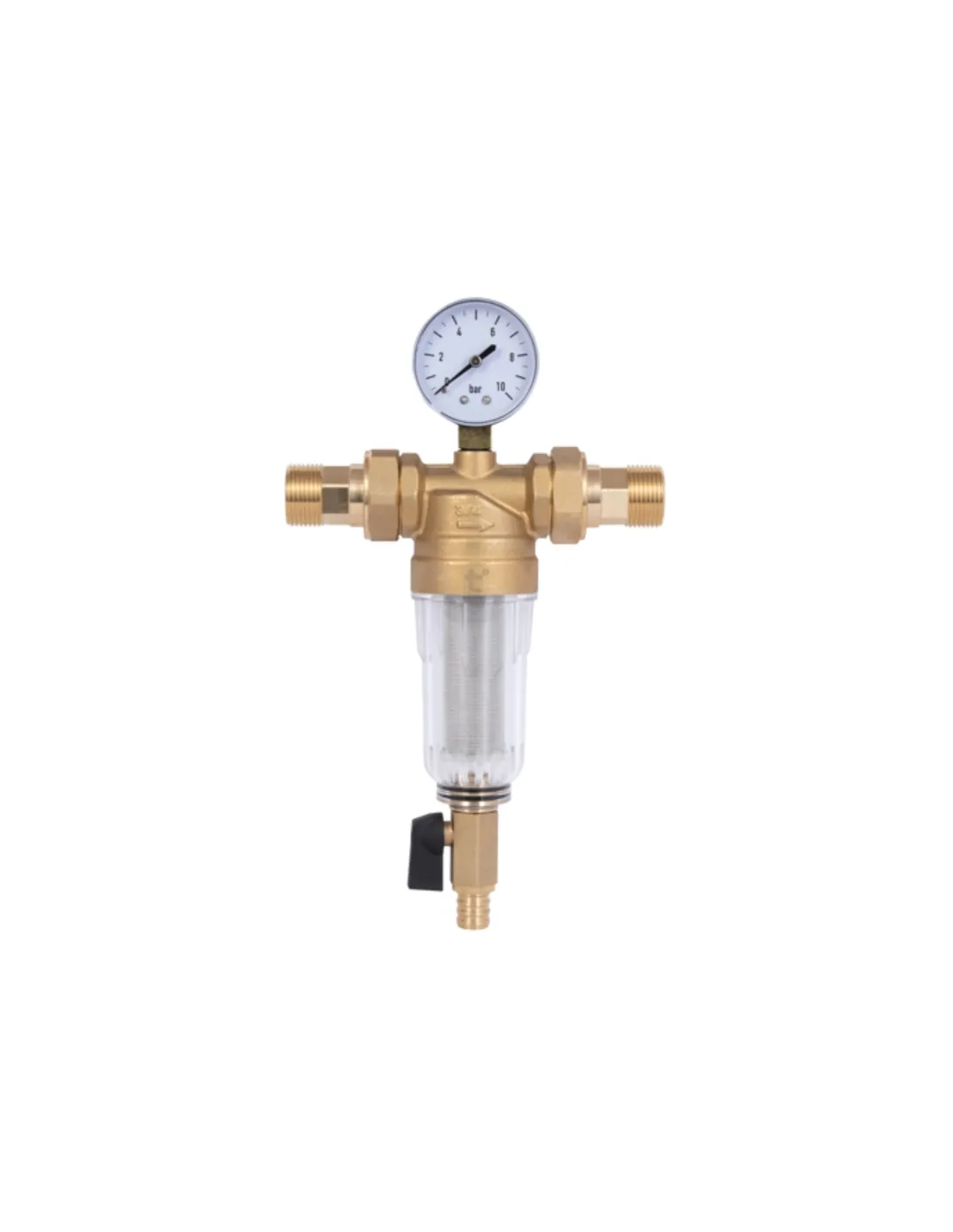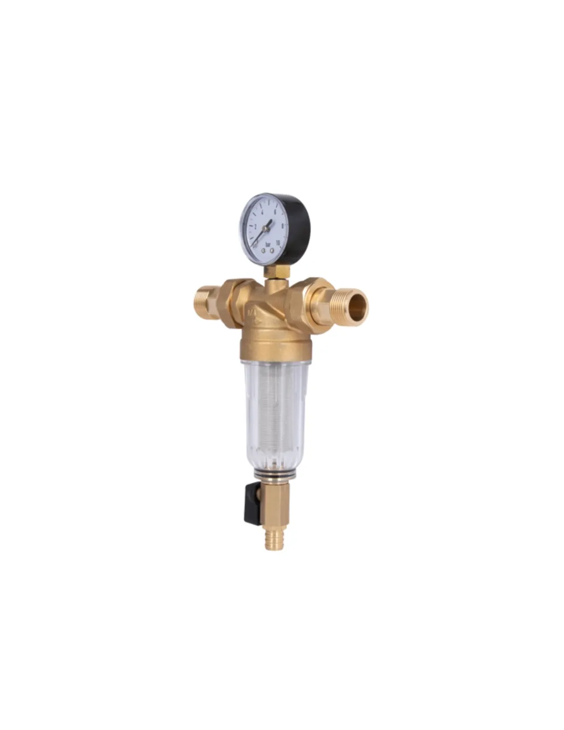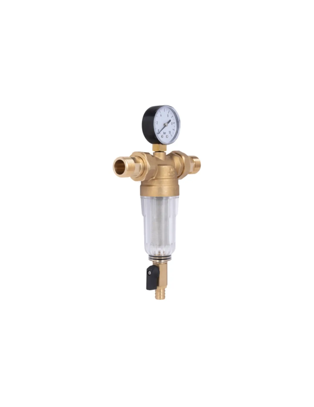 Цей фільтр повинен бути встановлений на горизонтальній ділянці трубопроводу зливним клапаном вниз, а напрямок потоку повинен відповідати напрямку стрілки на корпусі фільтра. Корпус та фітинги виготовлені з латуні, виріб укомплектований манометром зі шкалою вимірювань від 0 до 10 бар. Дренажний клапан зі шланговим штуцером дозволяє проводити як пряме, так і зворотне промивання фільтра.