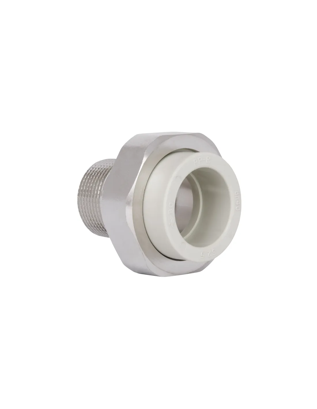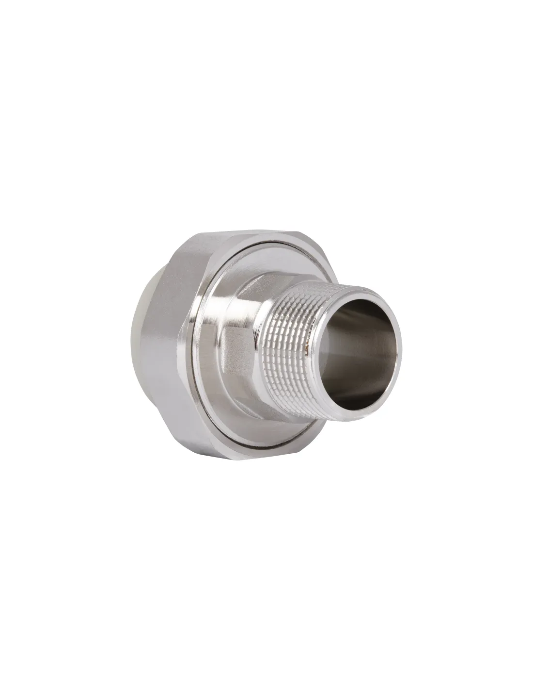 Фитинг выполнен из высокопрочного PPR PN20 и оснащен латунным резьбовым элементом с накидной гайкой. Такое сочетание материалов обеспечивает устойчивость к давлению до 20 бар, коррозии и химическому воздействию. Разборная конструкция упрощает техническое обслуживание системы.