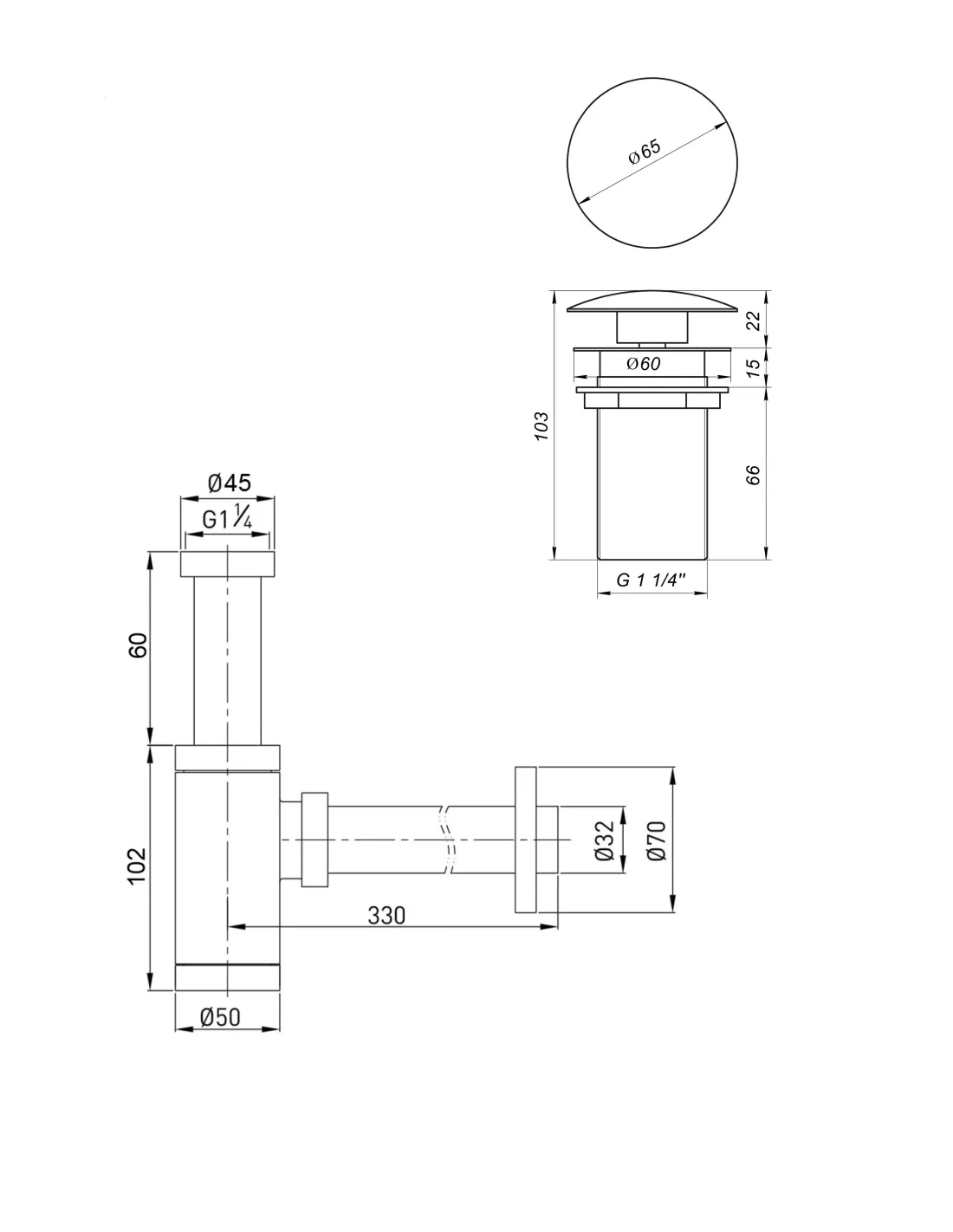 - Диаметр патрубка в канализацию - 32/70 мм,