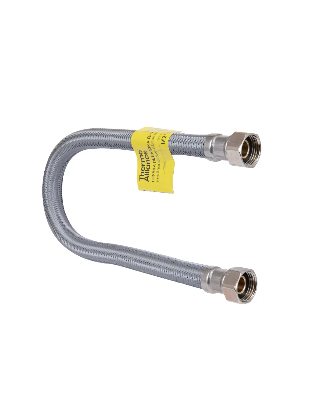 Шланг для підведення води Thermo Alliance Forte D10 TAF383W30 - міцна та надійна гнучка підводка для води, виготовлена з гуми, нейлону та латуні. Для приєднання до сантехнічного пристрою та водопроводу на кінцях шланга розташовані гайки 1/2 дюйми з нікельованої латуні. Виріб чудово гнеться в будь-який бік.