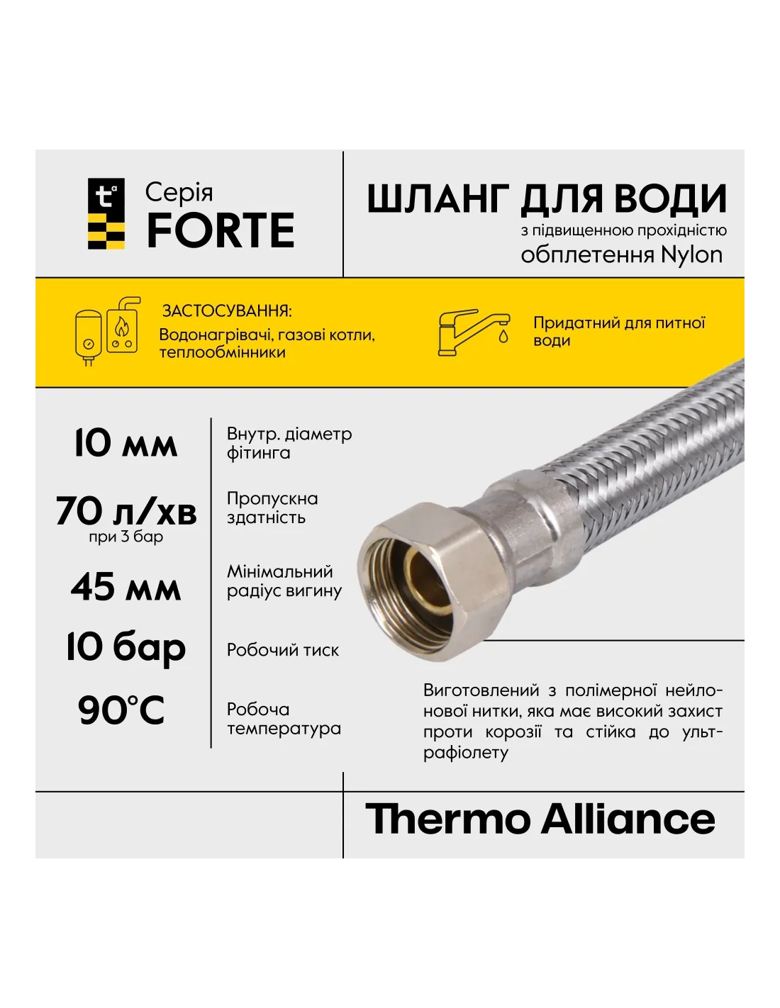 Шланг для підведення води Thermo Alliance Forte D10 TAF383W30 застосовується для підключення сантехнічних приладів, таких як: унітази, душові кабінки, бойлери, біде, змішувачі, пісуари та інші пристрої в системі холодного та гарячого водопостачання. Акуратний естетичний зовнішній вигляд дозволяє за необхідності залишити підводку на очах.