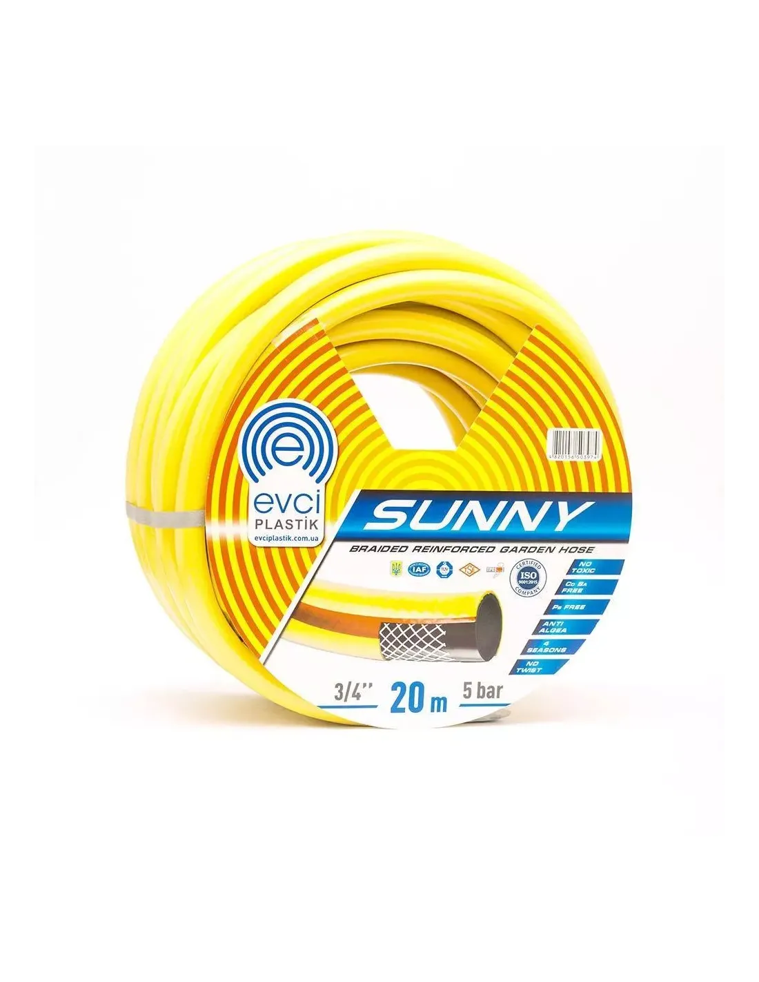 Шланг для поливу EVCI Plastik Sunny 3/4 дюйма, 20 метрів, армований призначений та використовується для поливу саду та городу, а також для догляду за присадибною ділянкою. Шланг 3-шаровий армований, виготовлений із м`якого ПВХ. Надійний та якісний поливальний шланг, який прослужить довгі роки. Представлений у жовтому кольорі. Робочий тиск: 5 бар. Діаметр загальний – 3/4 дюйми або 19 мм. Робоча температура: від -5 до 60 градусів за Цельсієм. Довжина шлангу: 20 метрів. Гарантія – 12 місяців. Країна-виробник - Україна.