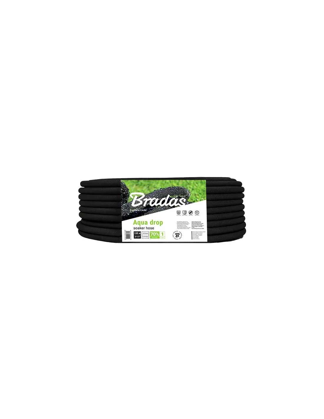Шланг для поливу, що сочиться Bradas Aqua-Drop 1/2 дюйма, 100 метрів виготовлений зі 100% гуми, що пройшла спеціальну обробку для забезпечення проникності по всій довжині шланга. Такий шланг призначений і використовується для забезпечення краплинного поливу невеликих ділянок та є раціональним вирішення питання поливу рослин, висаджених рядами. Також шланг, що сочиться, рекомендується для поливу культур, які не люблять попадання води на листя.