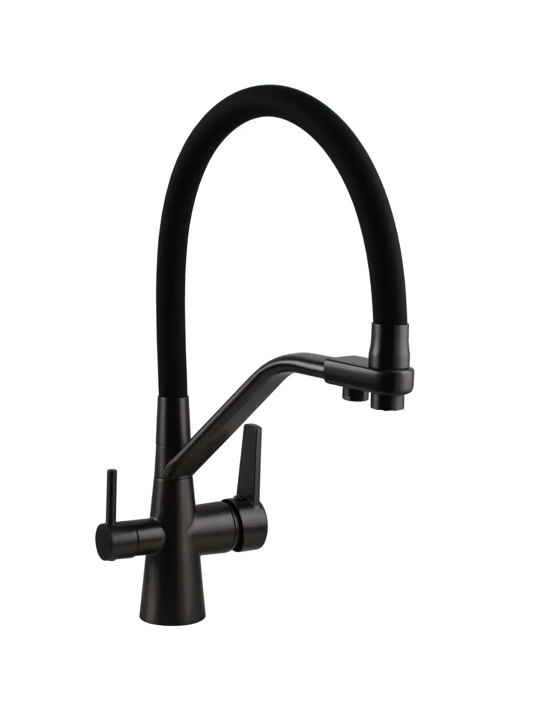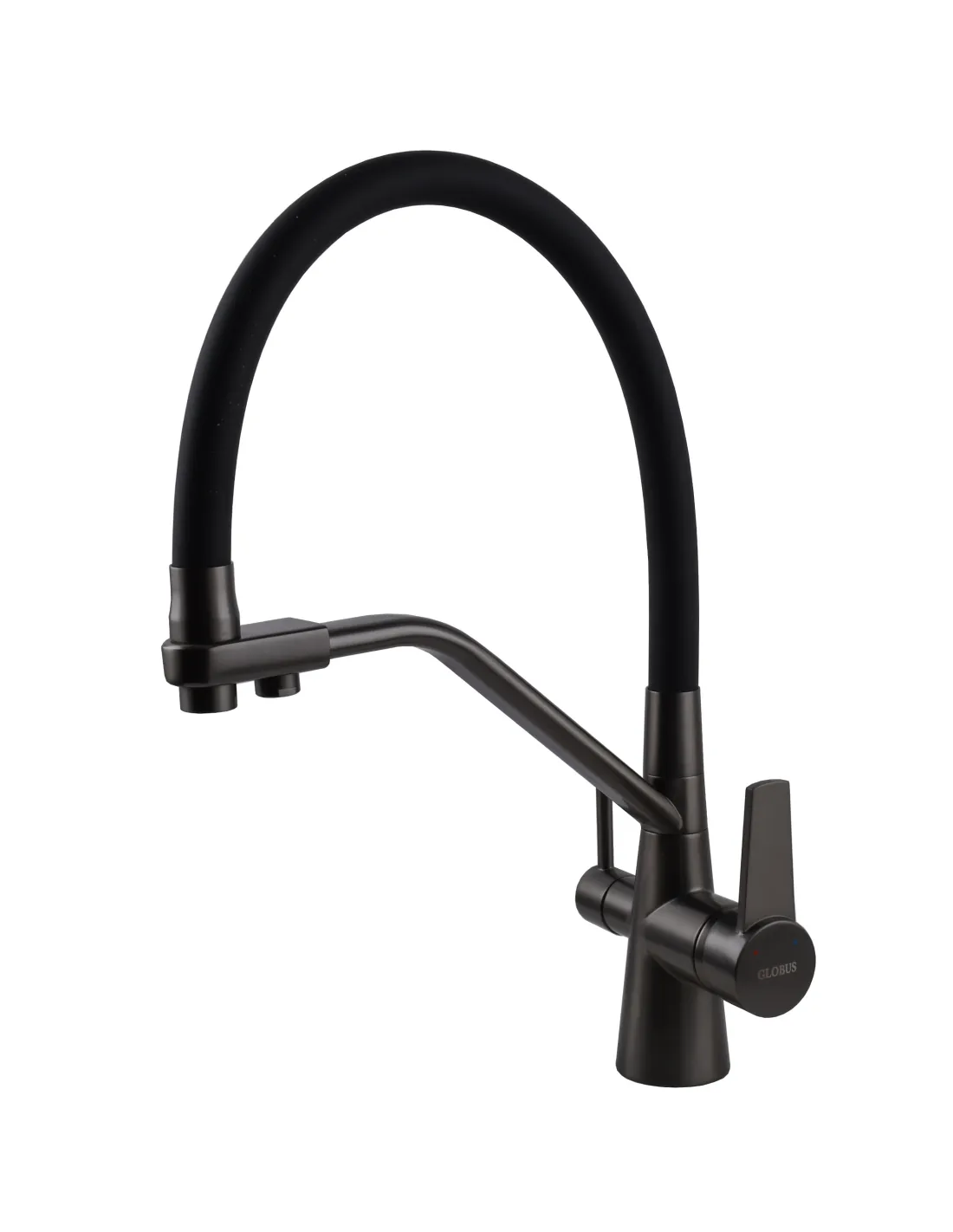 Смеситель для кухни с подключением к фильтру Globus Lux GLLR-0801-L-11-01 произведен из латуни. Покрытие крана матовое черное, которое не стирается при длительном использовании. В процессе изготовления смесителя использованы новейшие инновационные технологии производства. Излив поворотный, гибкий.